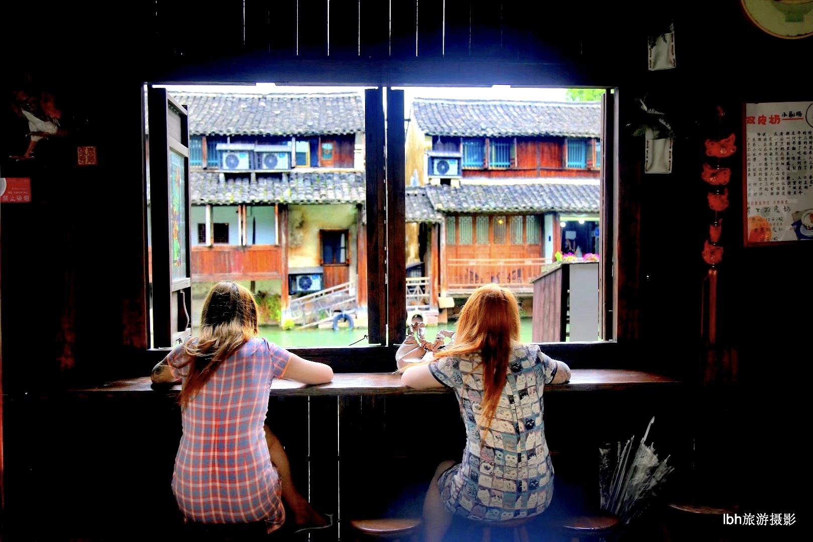 的茶馆,窗外是古镇风光,这样拍比正面更有意境。