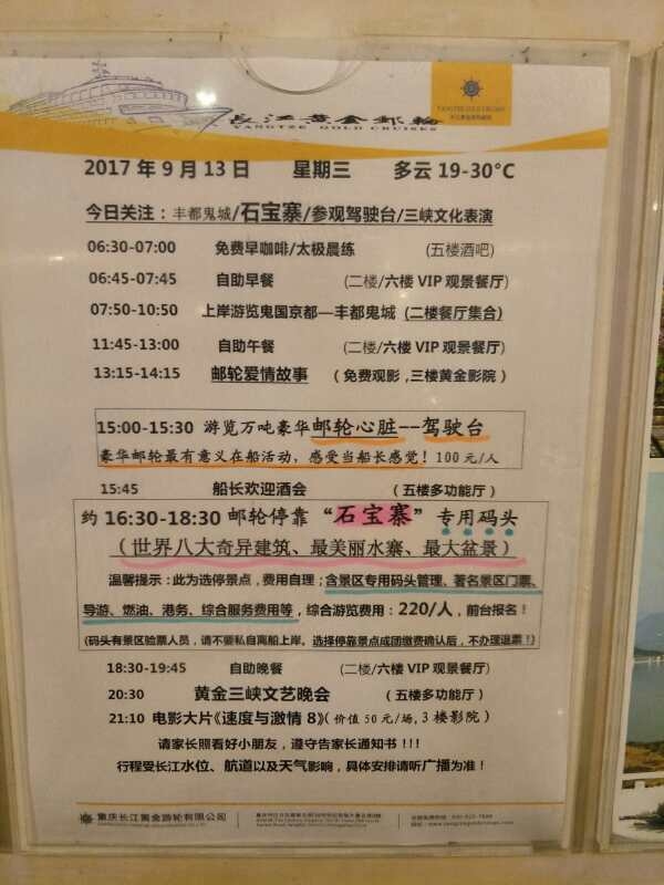 两岸的风景,有5、6个景点会靠岸上去游玩(如丰都、石宝寨、白帝城、小巫峡、