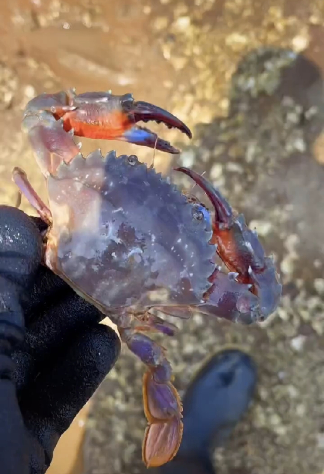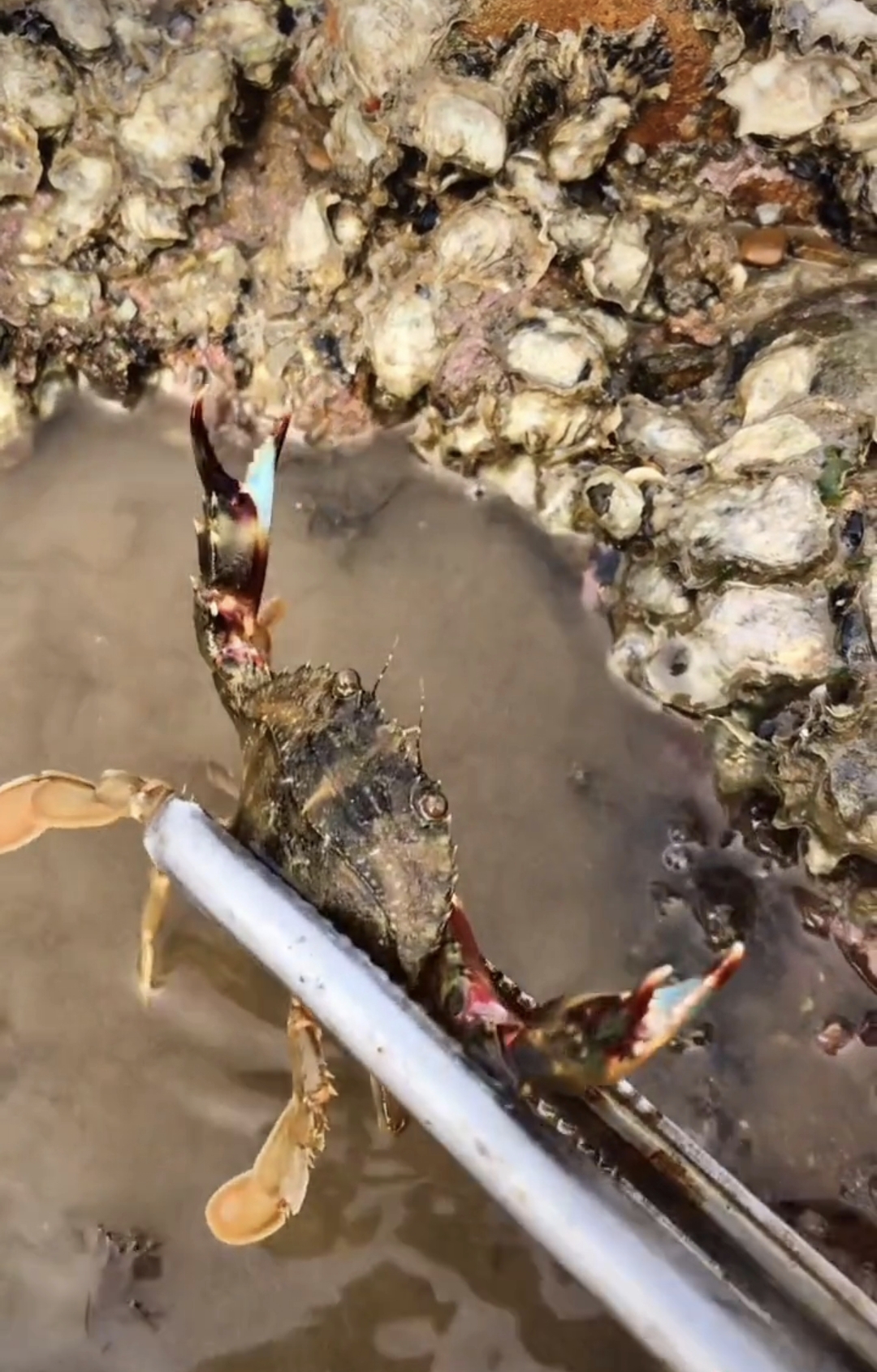 大螃蟹,我抓住你了!抓后面,新手最好用铁夹子!带好手套!