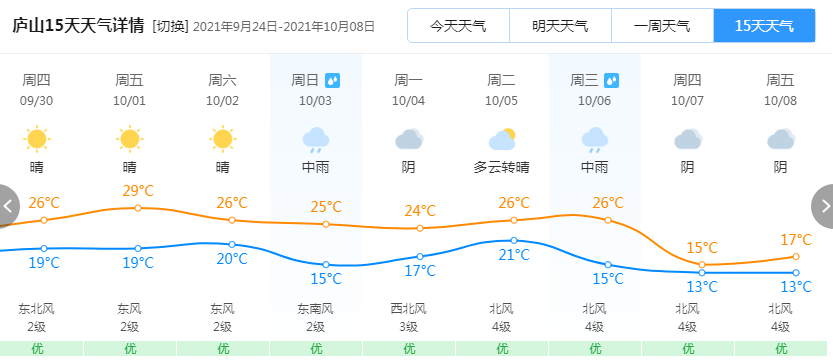 [题主采纳]现在去庐山,天气情况还是比较舒适的,3号和6号会下雨,7号气温会大幅度下降,如果是十一小长假去玩,总体来讲天气还是不错的。========== 如果你觉得TA的回答不错,快来给TA点个赞吧! 你的支持是对作者莫大的鼓励~显示全部