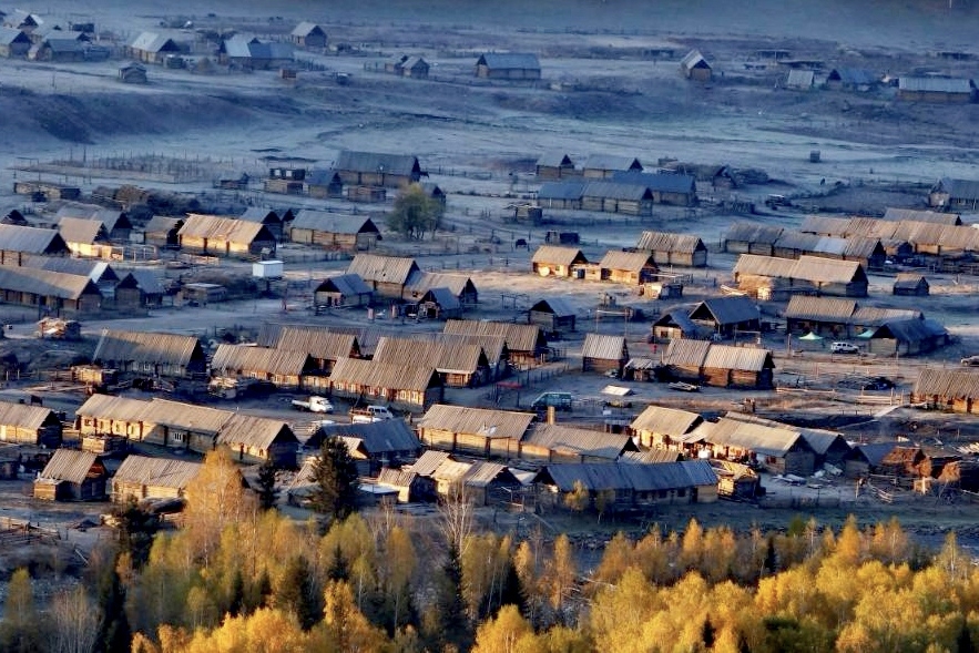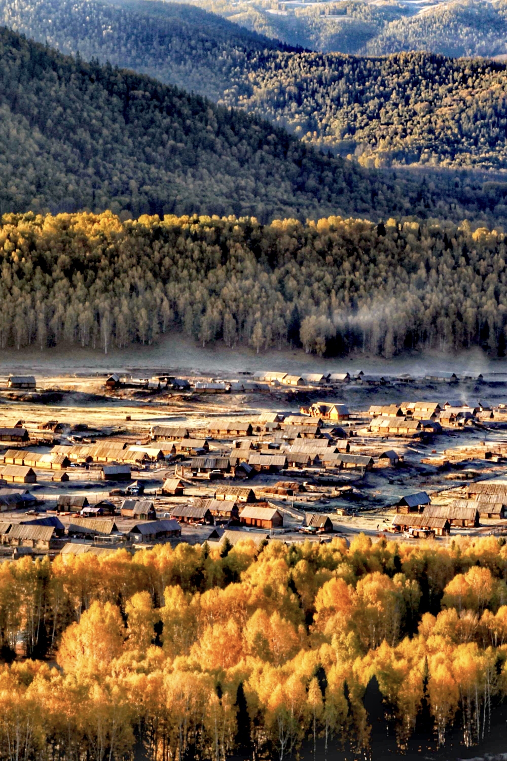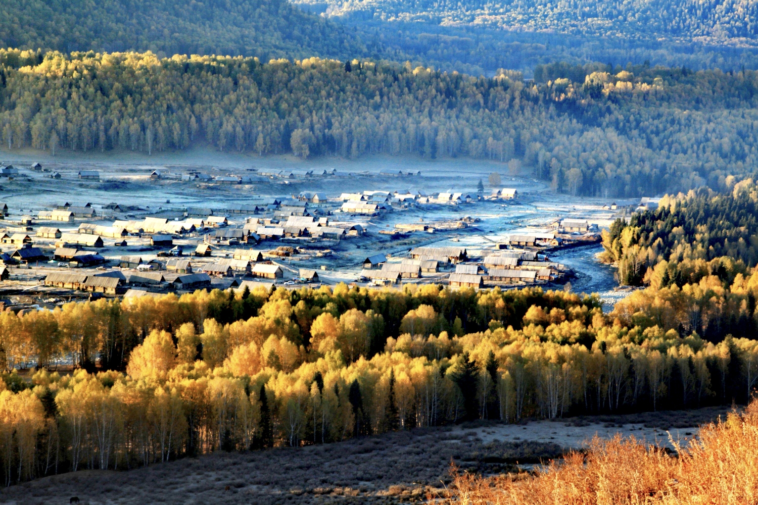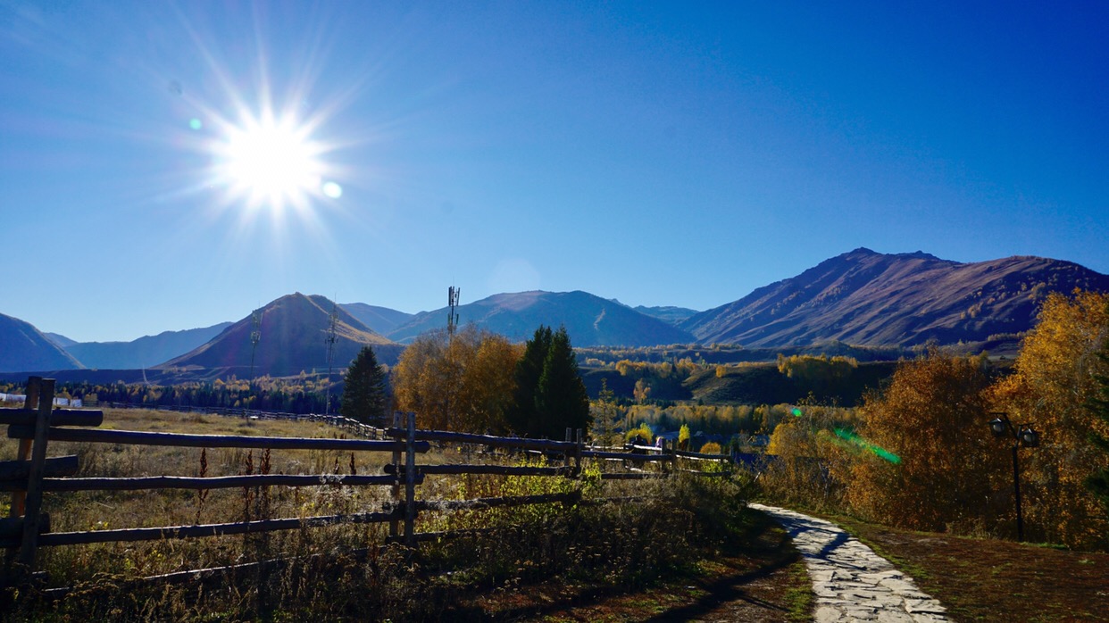 高升起,毫不吝啬地把阳光倾泻到大地上,倾泻到村落里的房屋、树木、围栏上,把村子染成了万山红遍的醉人秋色。