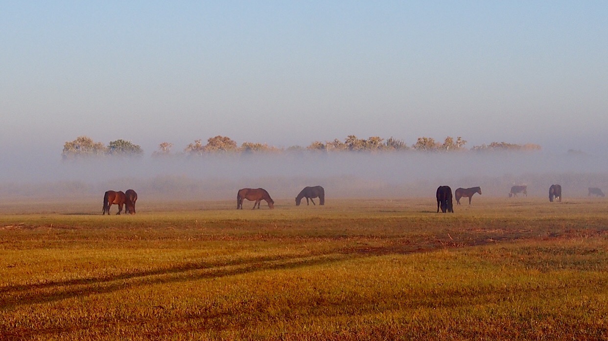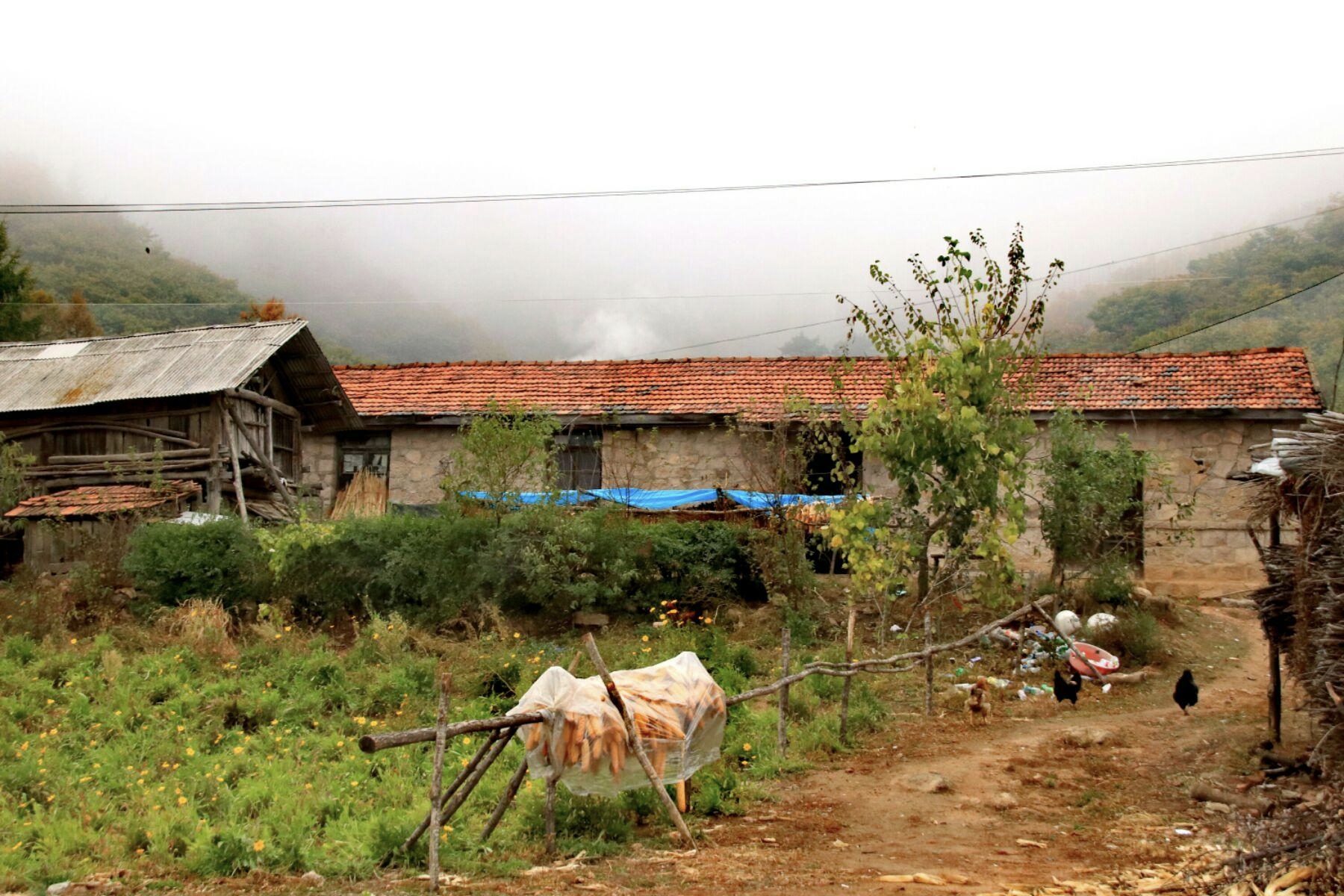 清晨,太阳还没有升起,浓重的雾蔼笼罩着整个村庄,树木、房屋、围拦,都在雾色中若隐若现。屋顶上薄薄的秋霜泛起蓝盈盈的光,村庄一片寂静。