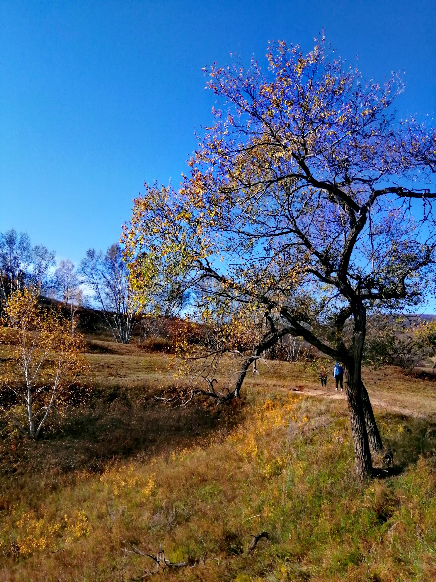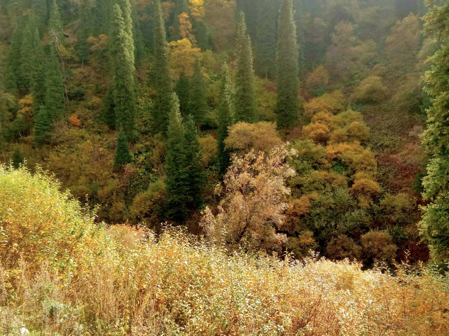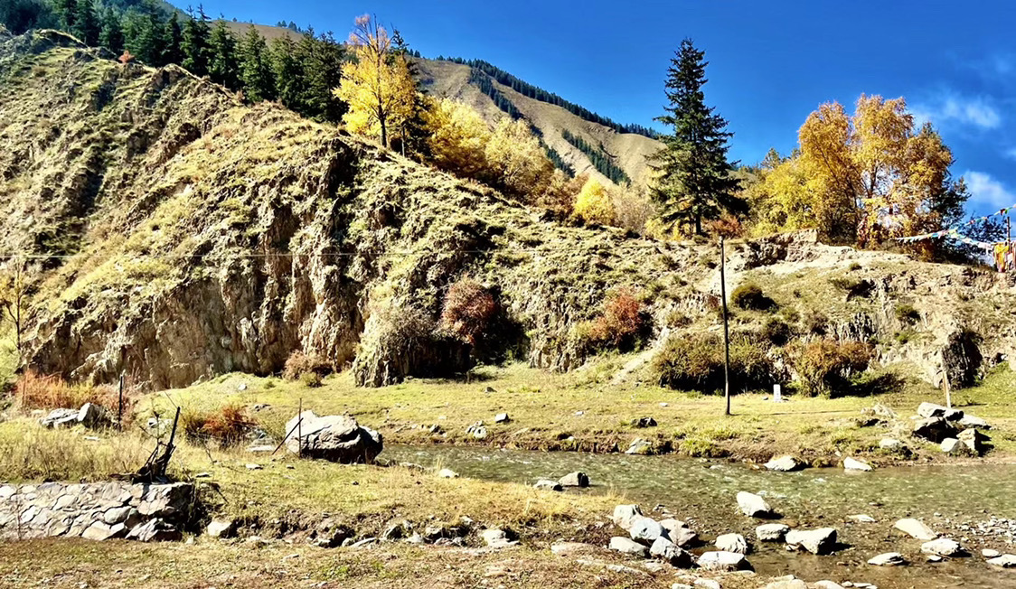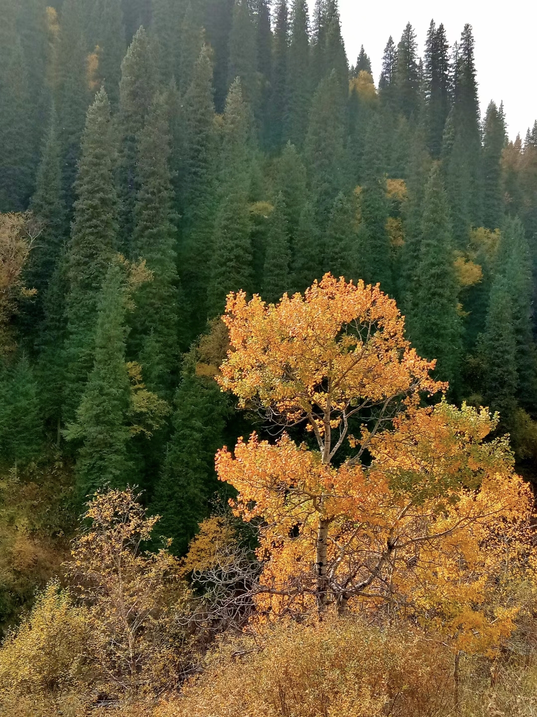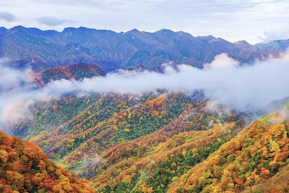 从谷底到山巅各色树叶满山匾额犹如打翻的调色盘,美不胜收千叶万树,色彩分层一树引领,满沟呼应山林都随色彩跃动起来