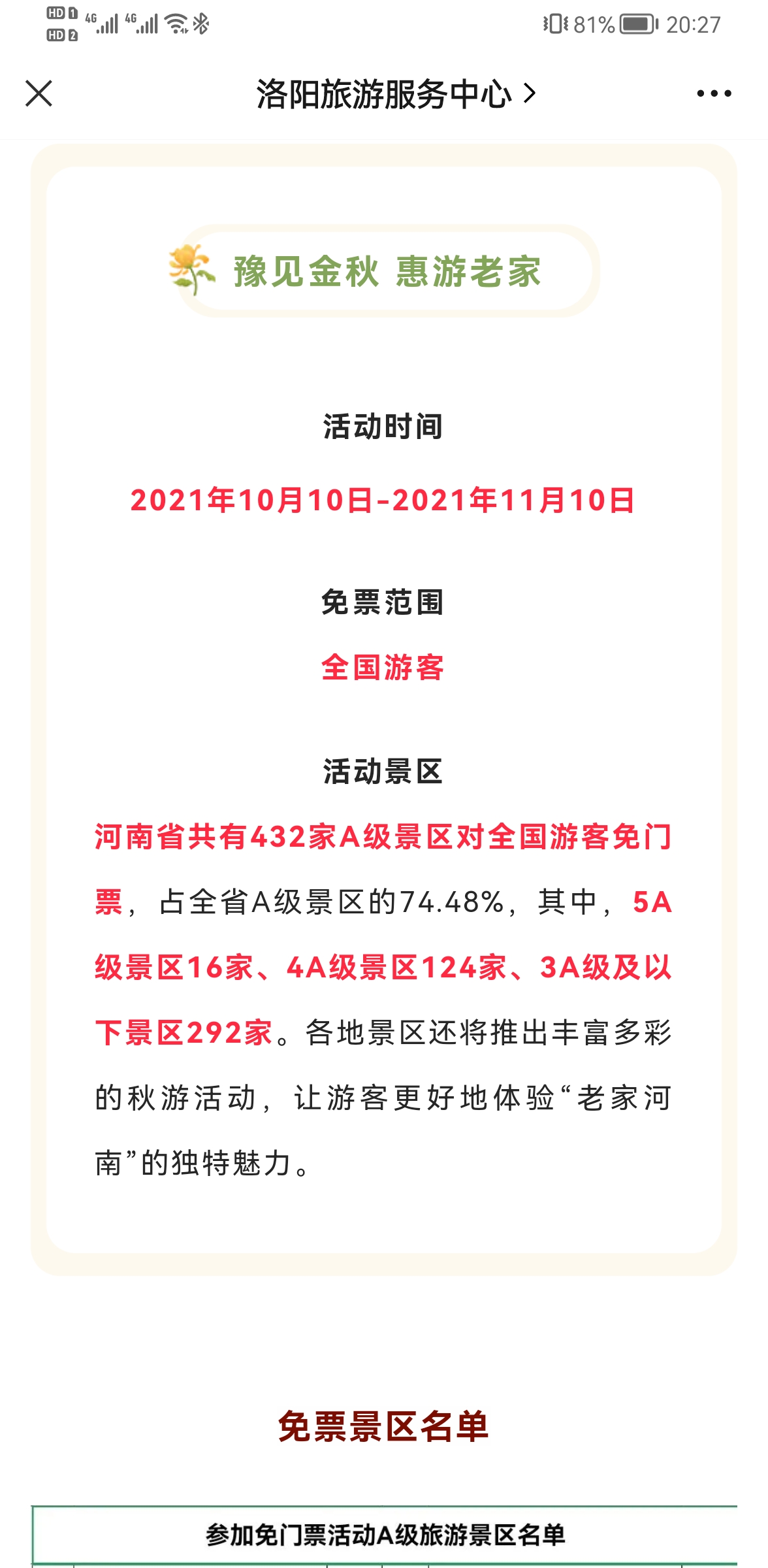 [题主采纳]十月底十一月初,国内最适合游玩的地方在哪里? 那大河南就是不二之选了。先来看看这则通告哦是的,河南几乎全境的优质景区都在免票范围内,是10月10日-11月10日这段时间内的,再来看看是内些优质景区呢?即使是网红景区老君山也是在公告发布后,第一时间也公布了同步的免票方案。上周六的时候...显示全部
