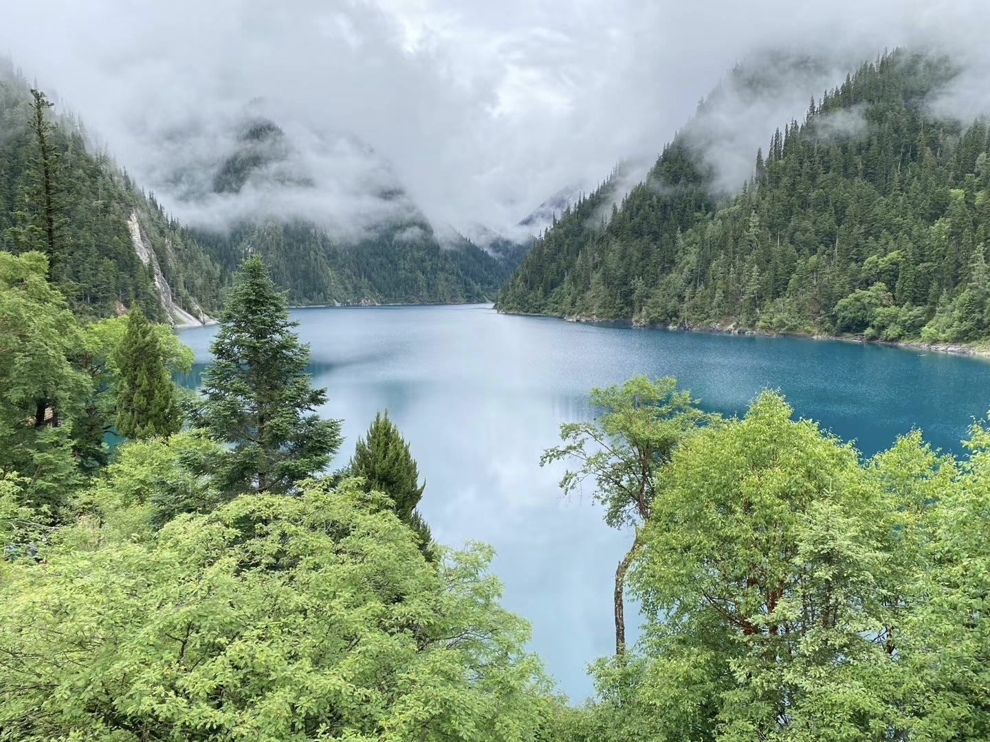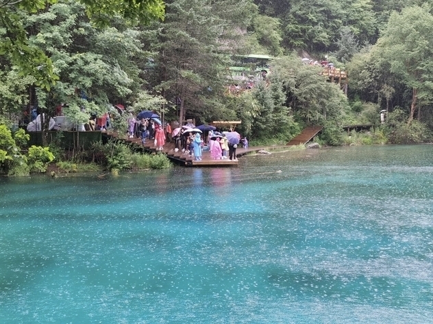 景点时是雨中前行 。我们中午抵达九寨五花海(右沟)下车时正值下大雨,而且一直下到游完珍珠滩瀑布步行返回诺日朗中心站才结束。尽管天宫不作美,对看风景、拍照带来诸多不便,但是依然感到一种莫大的乐趣。