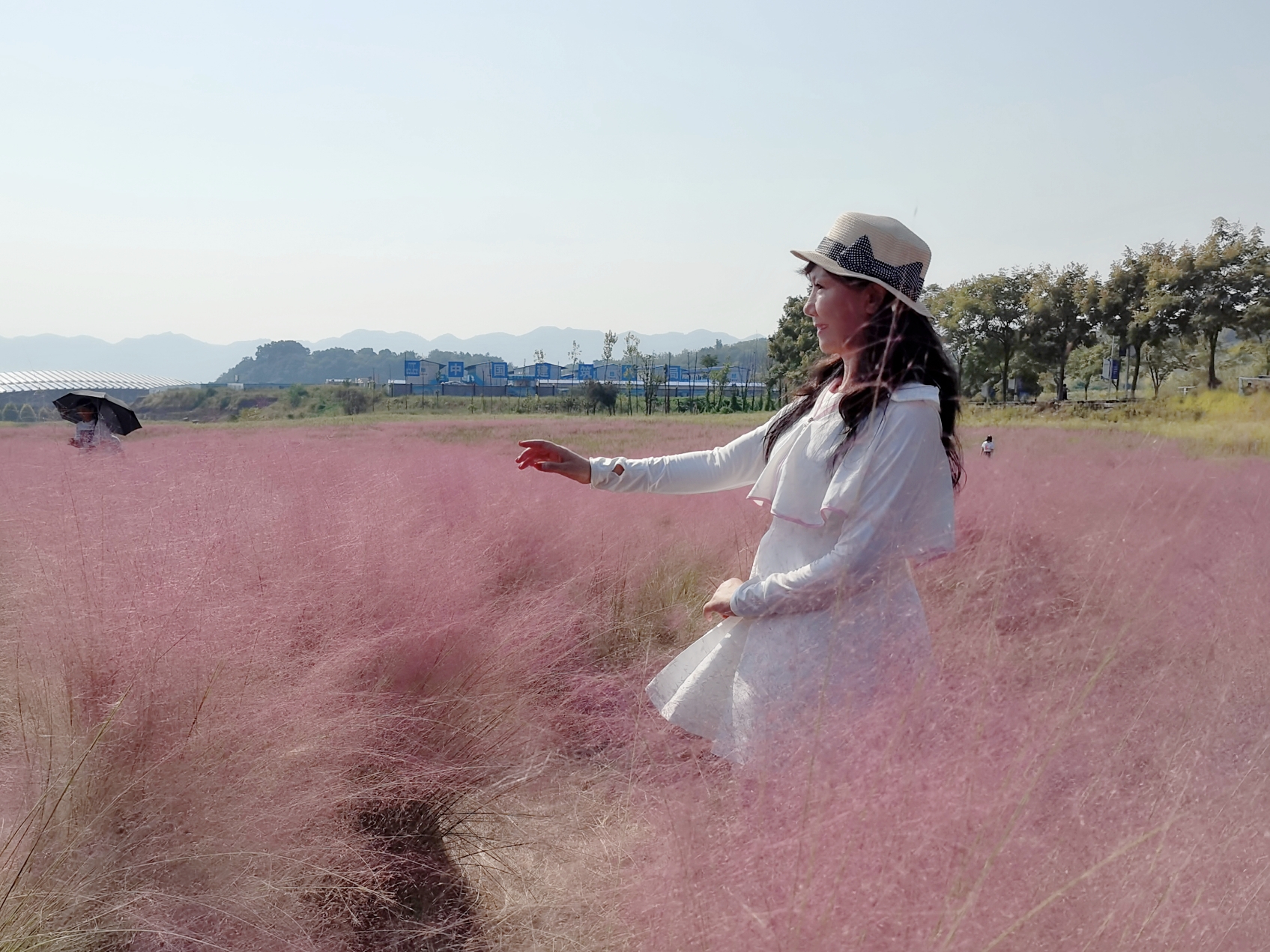 公园的粉黛乱子草位于公路下方,远远望去像是天边一团团粉粉的云雾,轻盈、柔和、飘逸。