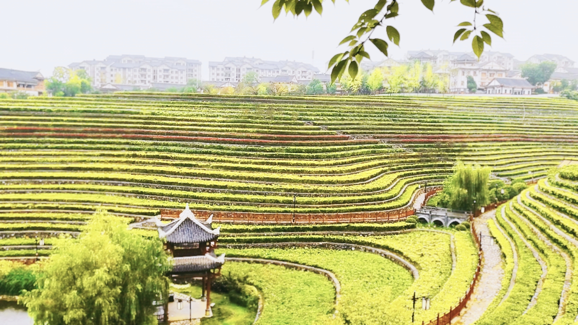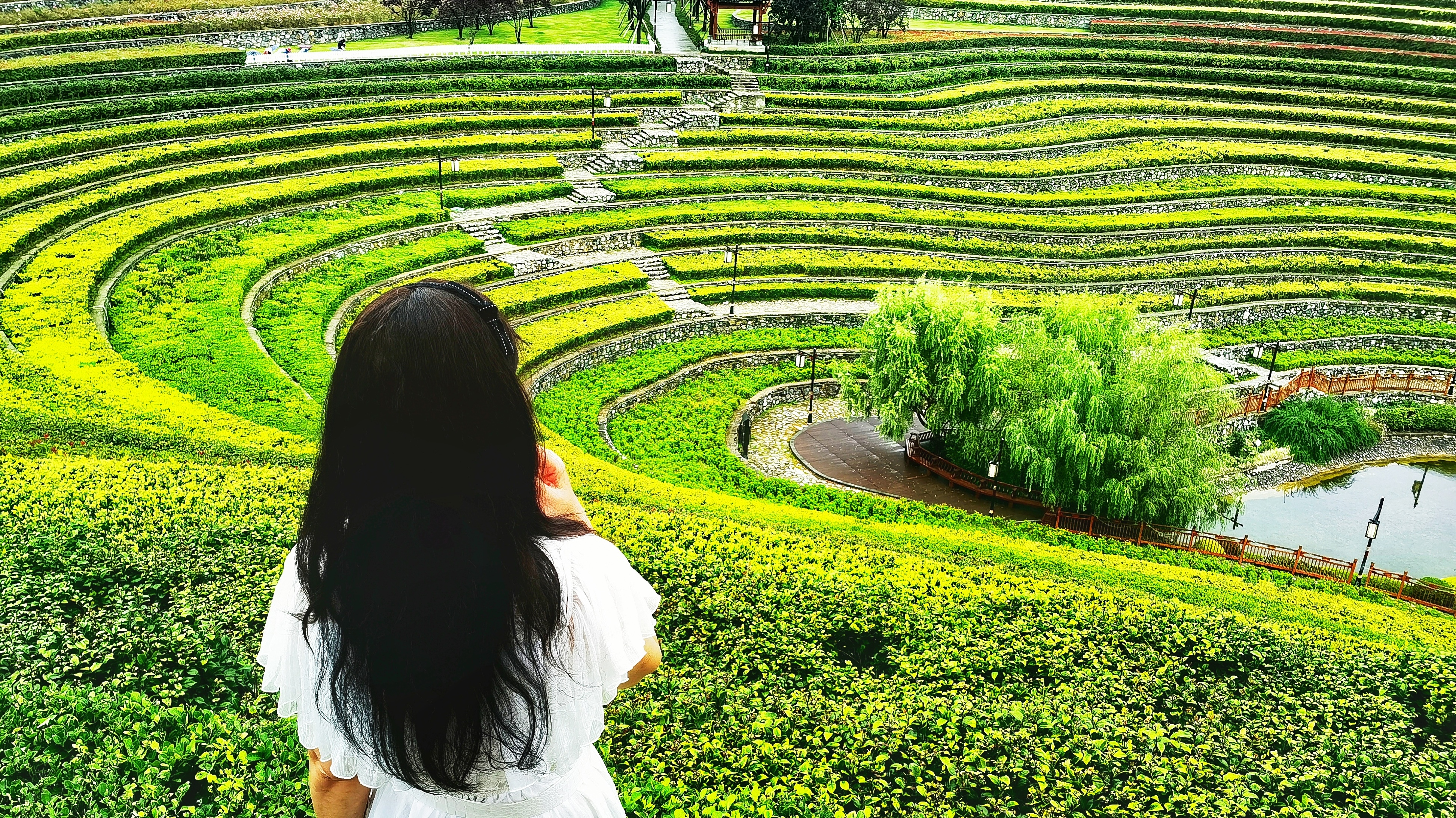 那一波又一波的线条像是流动的五线谱,那些植物便是跳动的音符,弹奏着优美的乐章。雨中的梯田,薄雾轻盈、妩媚动人,植物葱茏、芳草萋萋。在梯田的底部,又是一番风景让人眼前一亮,亭台楼阁,杨柳依依,池水清莹,鸟鸣声脆。我盘旋在花田里,走过原野,走过清秋,眼里装满了风景,心里全是欢愉!