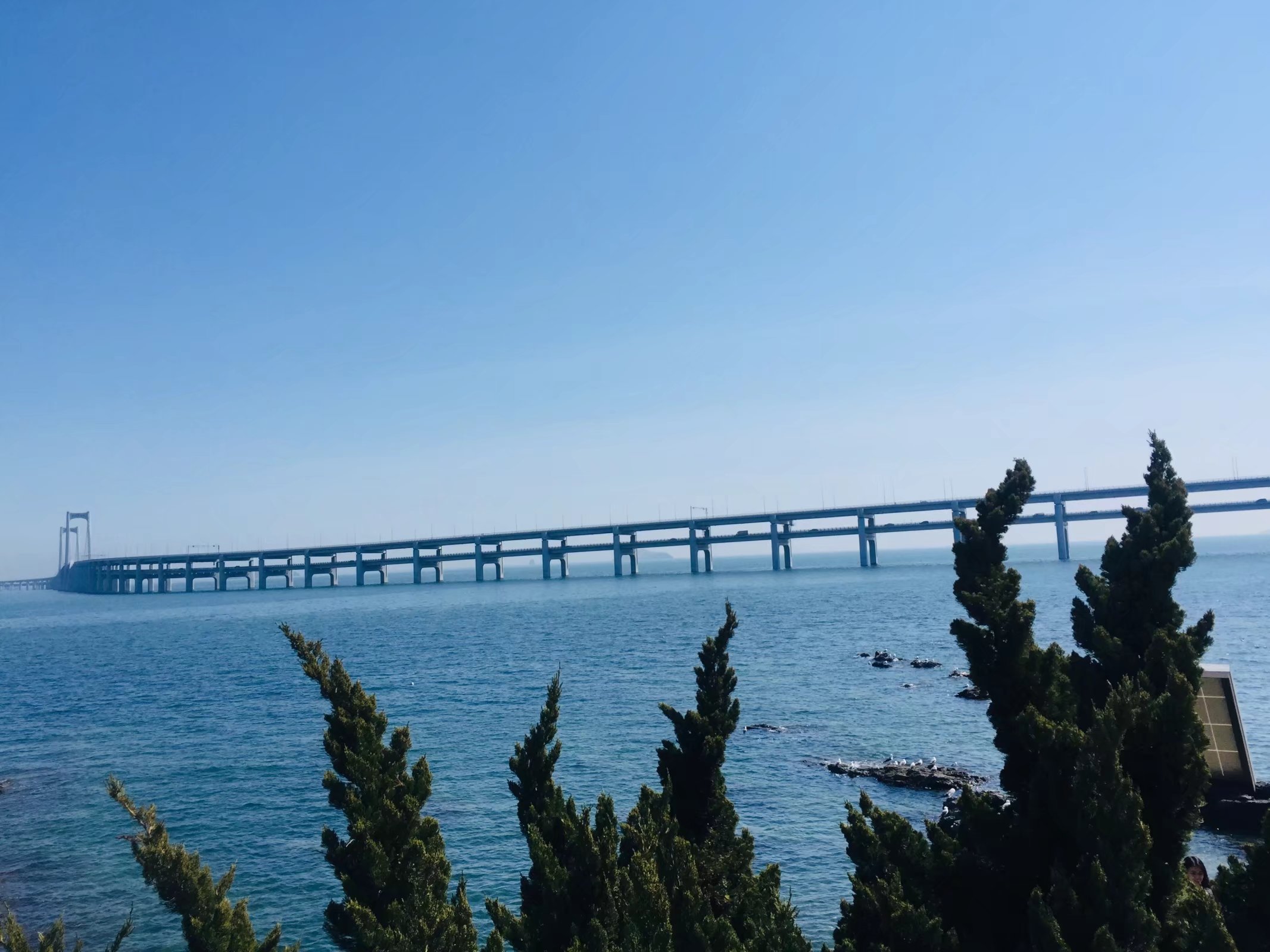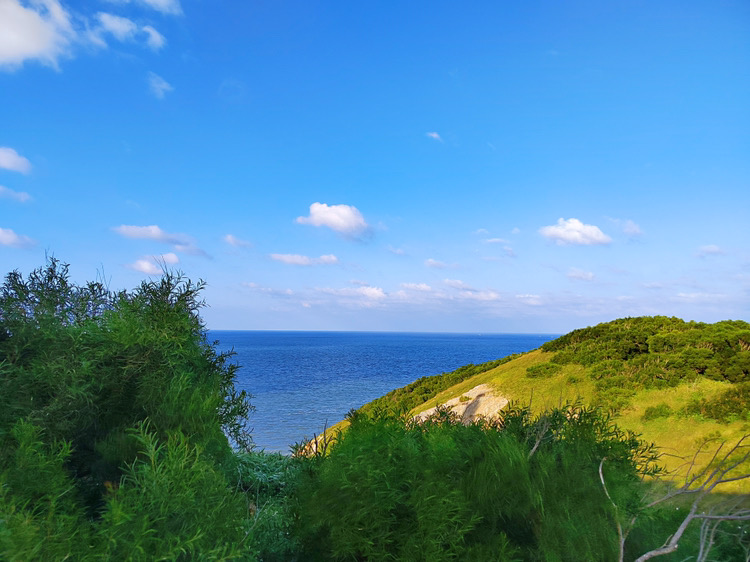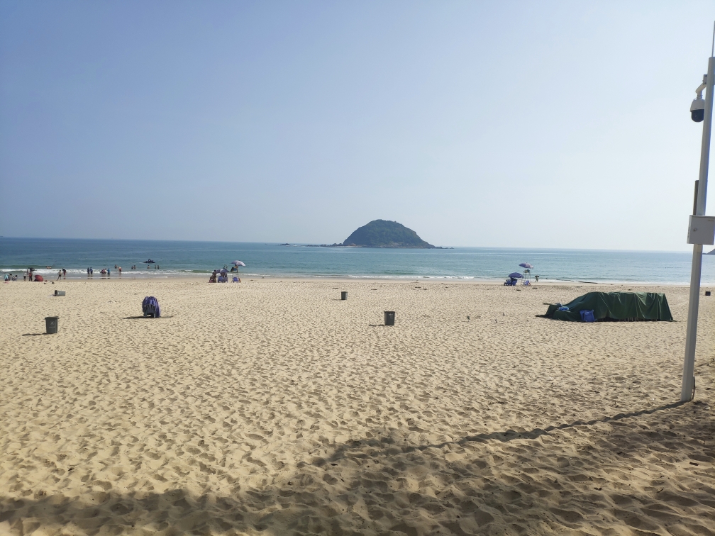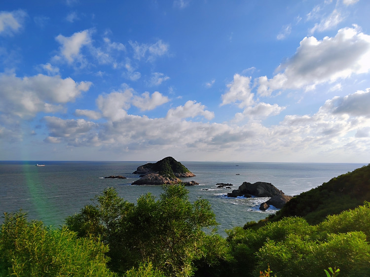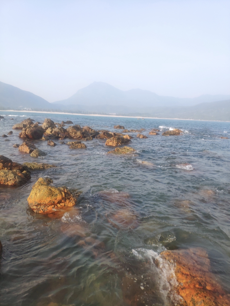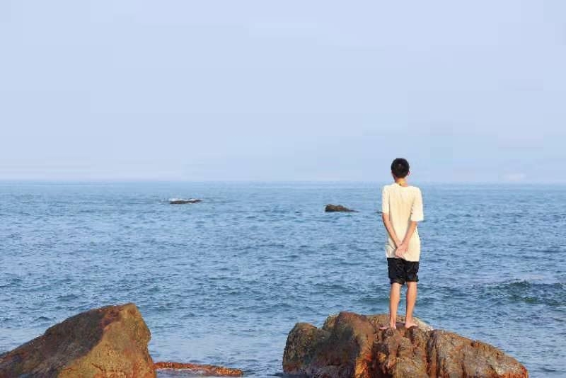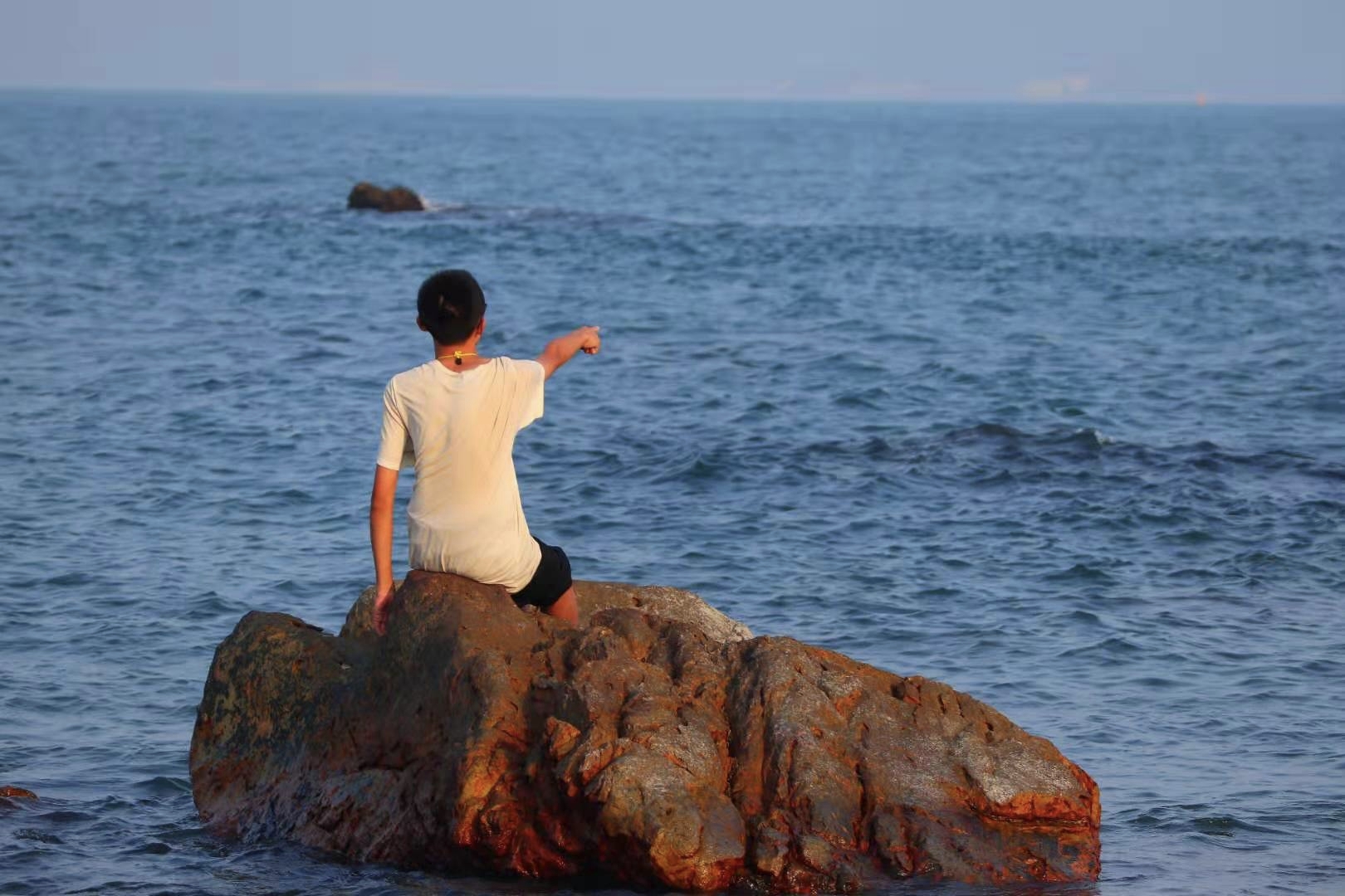 的西冲海滩(再远的地方不敢去了,因为疫情原因,单位最多只给个两天假),体会海浪拍打双腿的舒适感。并且我们找到了一片礁石滩,我费力地爬上最远最大的那块,在相机中留下了自己的身影。照片里的我甚至有一种“东临碣石,以观沧海”的既视感