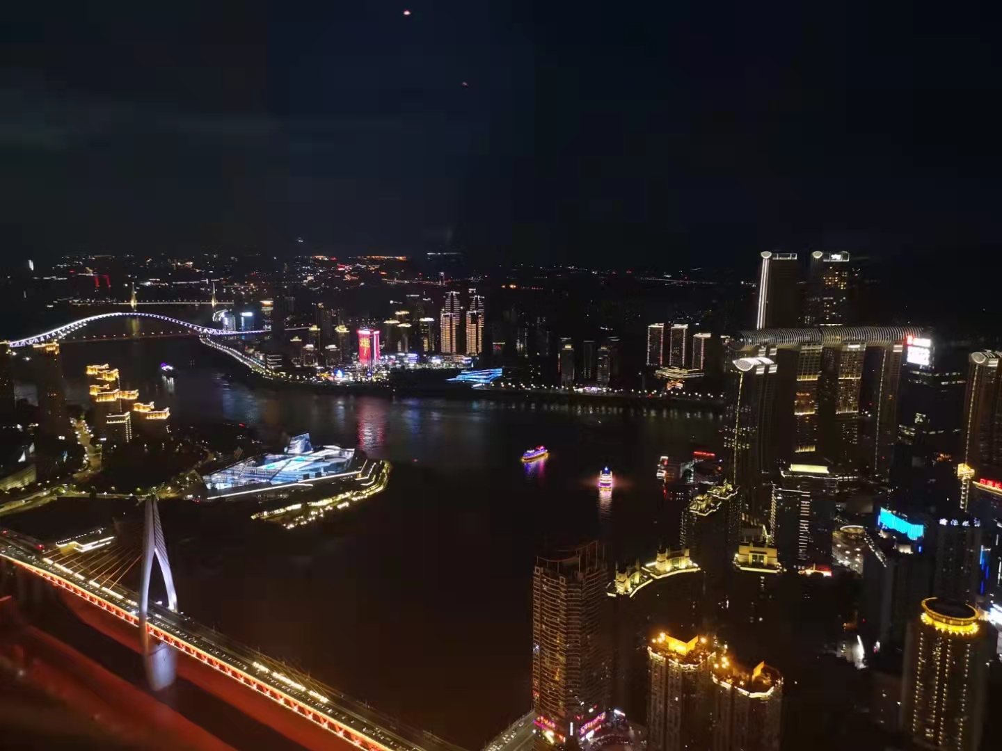 入夜,便是灯光和霓虹的海洋。长江上依次能看到鹅公岩大桥、菜园坝大桥、
