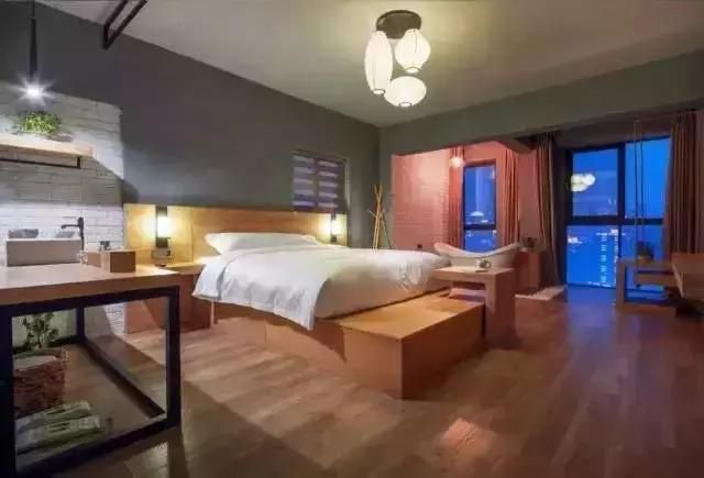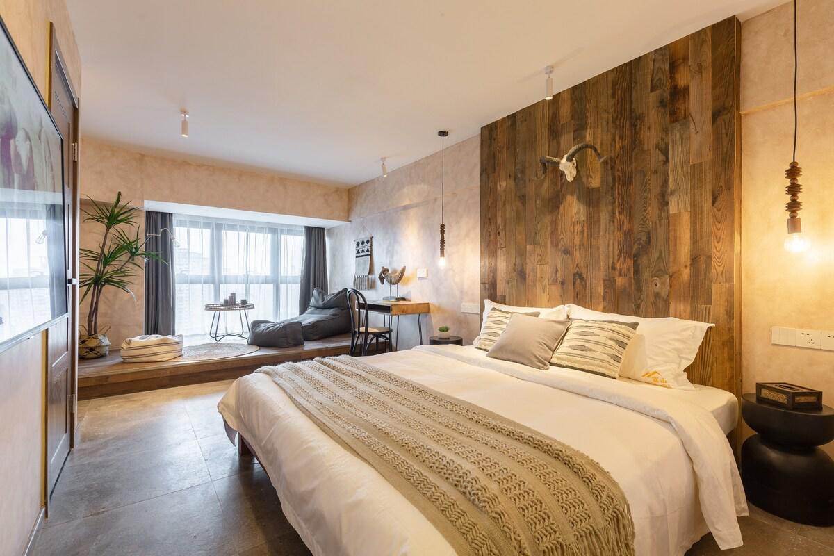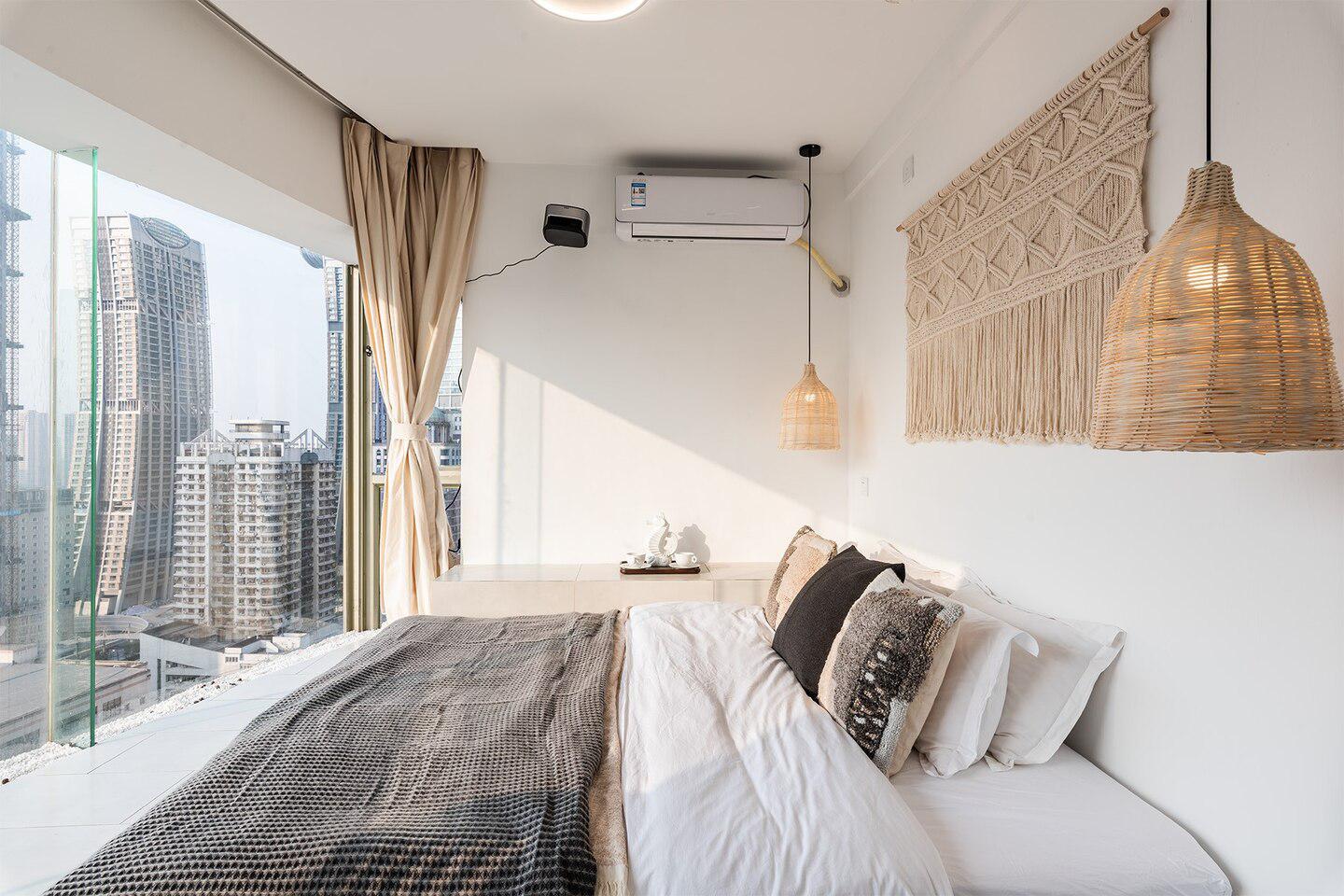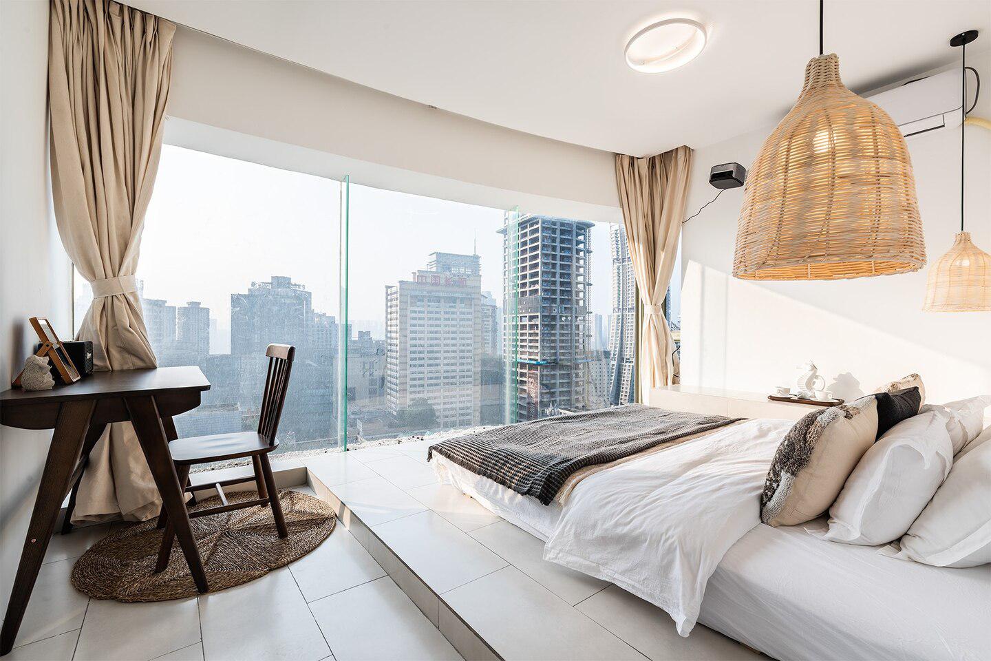 日式侘寂风,简约美学。超高层观景,俯瞰雾都。整个房间的色调都彰显了一个词:温柔。