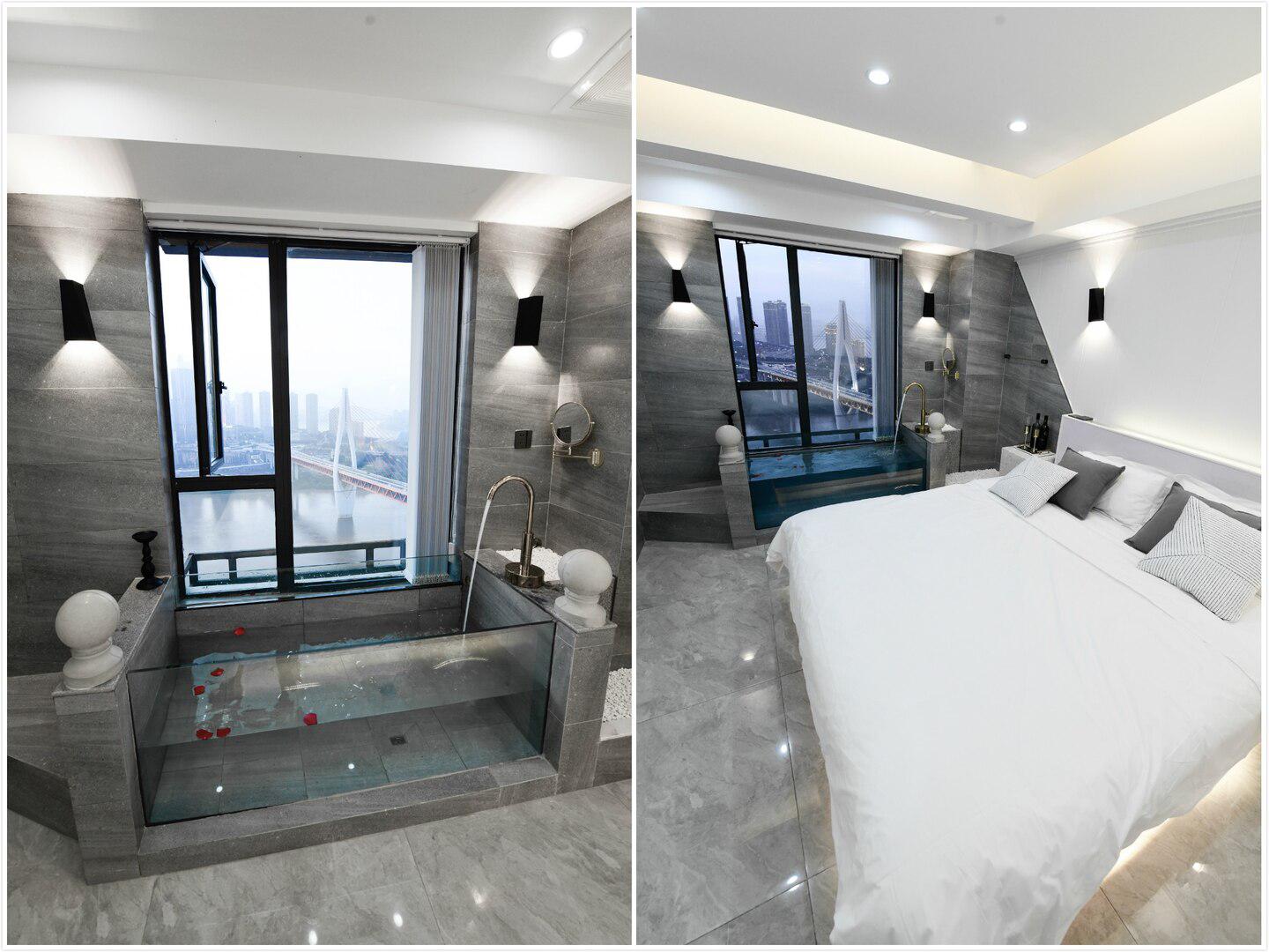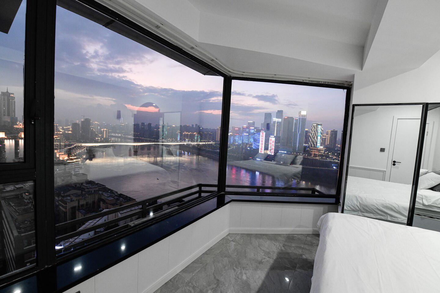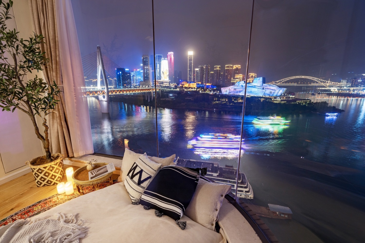 江景民宿的第一名,不服来杠。直接上重点,从270度的超大落地窗望出去,千厮门大桥全景尽收眼底,滚滚嘉陵江朝你奔涌而来,透视感真的绝了。民宿就在洪崖洞楼上站在24楼俯瞰万千,随便一张照片就算用手机拍都是大片。甚至这个不得不夸的无边观景浴缸,泡着花瓣澡红酒配美景这就是我的Dream house啊!民宿总共三张床每一张床,注意!是每一张床都能看到一线江景。