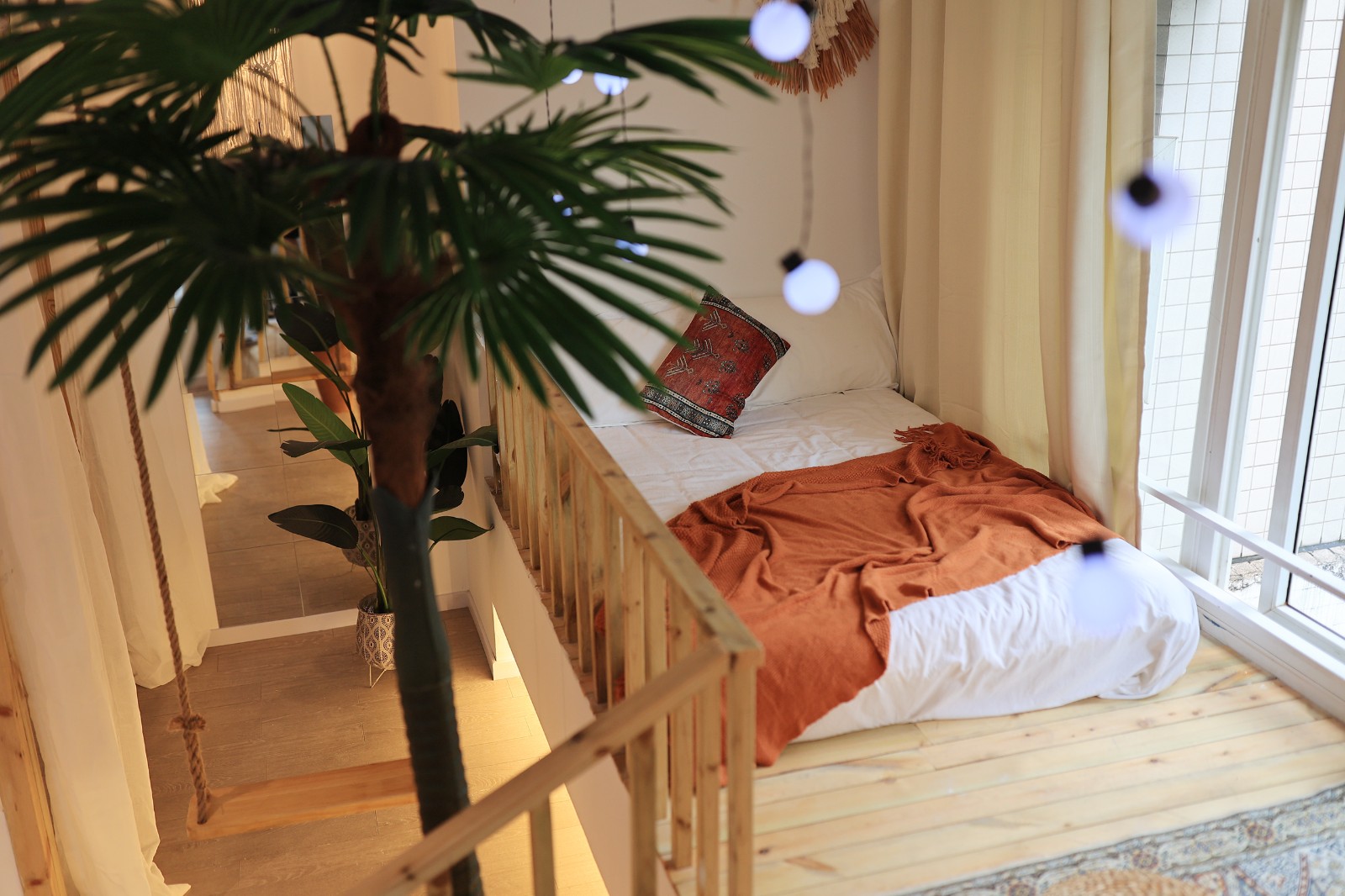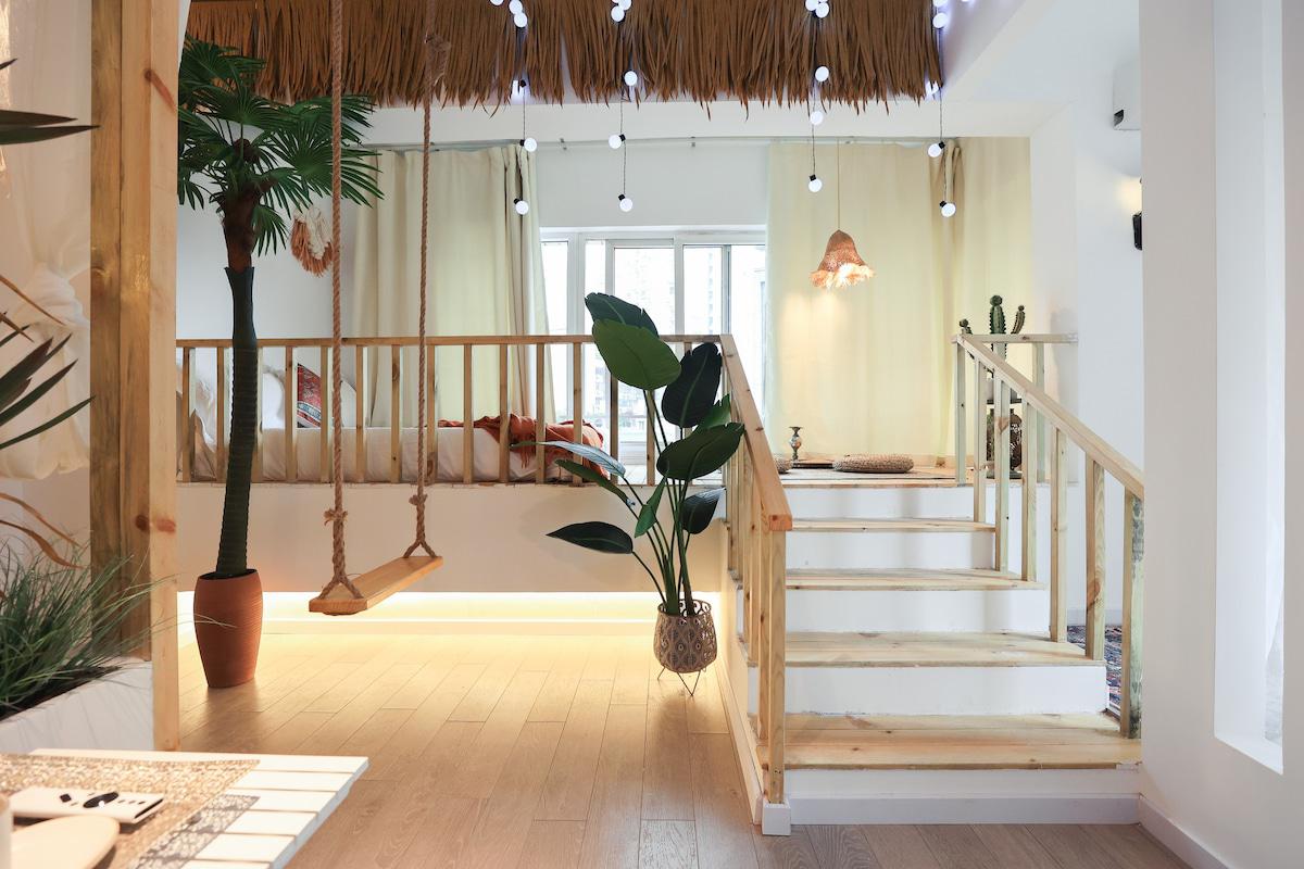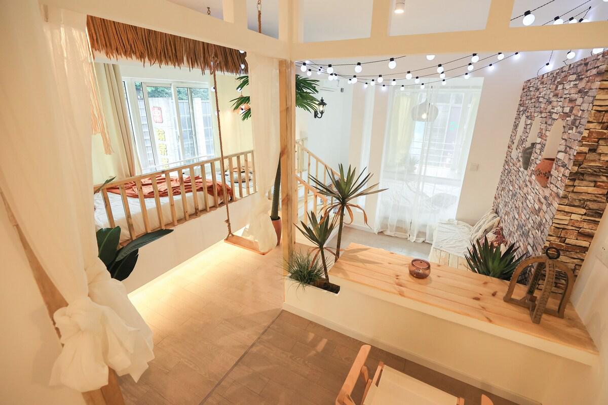绿植、茅草屋顶、半开庭院、榻榻米、秋千、小吧台,充满了度假风情,一秒置身小巴厘岛重点这家民宿真的好看,拍照超出片,坐在秋千上、木质楼梯上,或者侧身靠在吧台边,穿上小裙子,姿势随便摆,在星星灯和白纱的掩映下,直接出一套仙女写真大片。