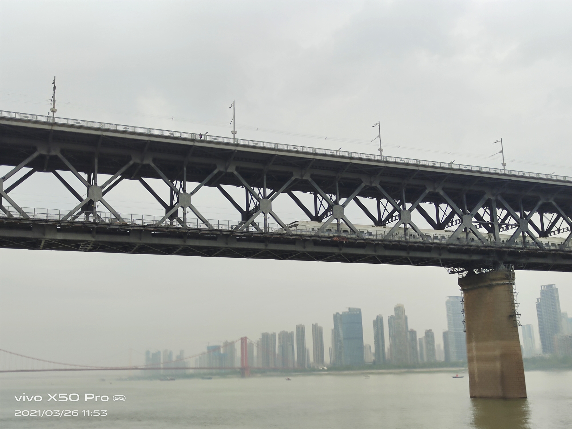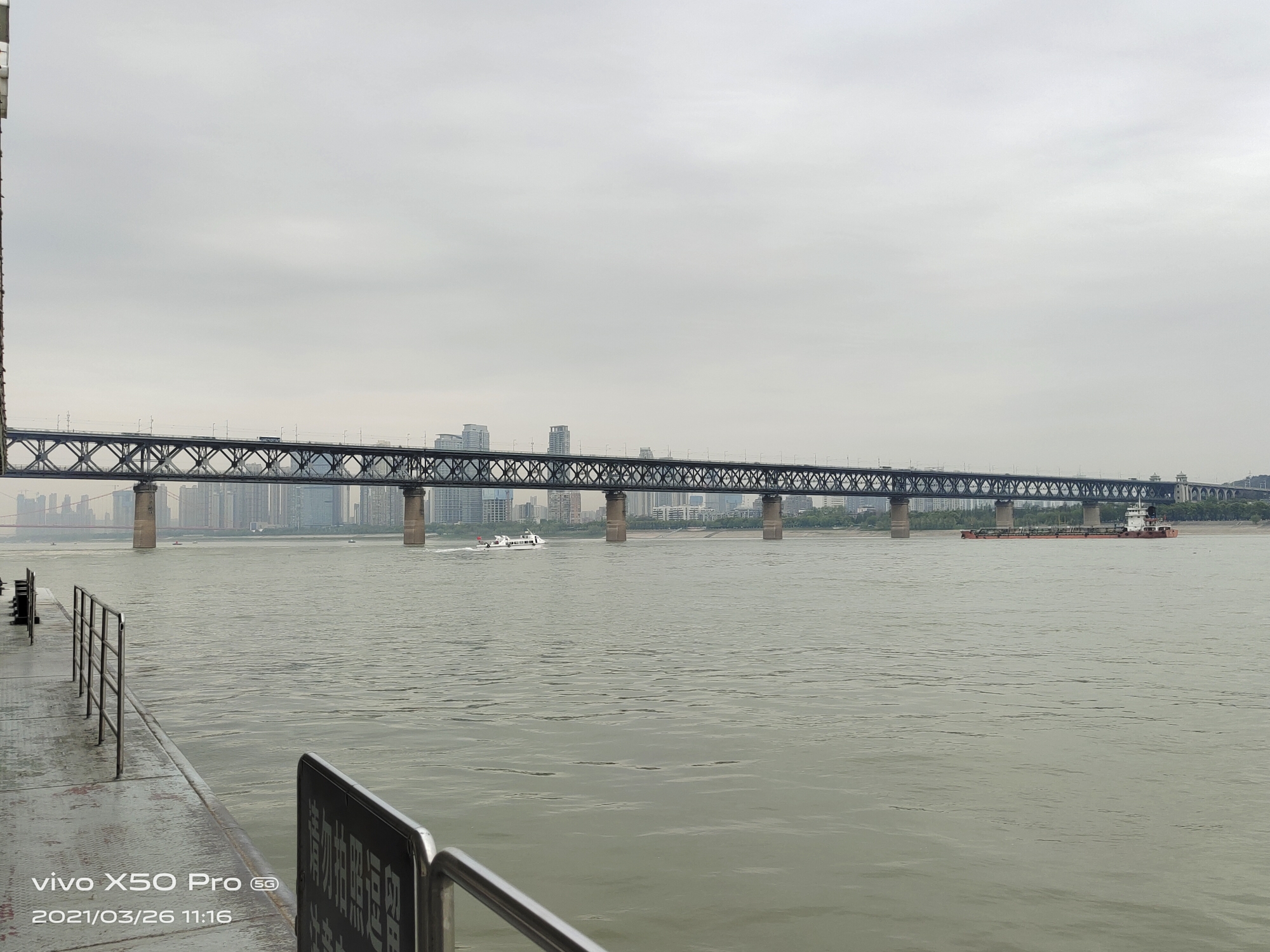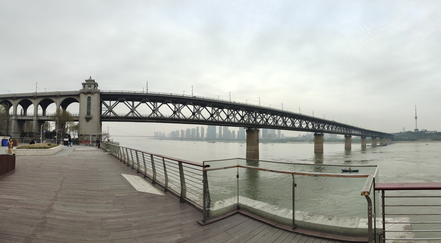 站在大桥上俯瞰江面(恐高勿入)。因为武汉长江大桥是双层的,上面走人和汽车,下层走各种铁路,桥下走长江水和轮船。所以走在桥面上会有震动感和三维立体的动感。真的是很特别的体验啊。所以恐高和晕车的人慎选。不想走的可以看到下面的码头了吗,坐轮渡就能过江了。