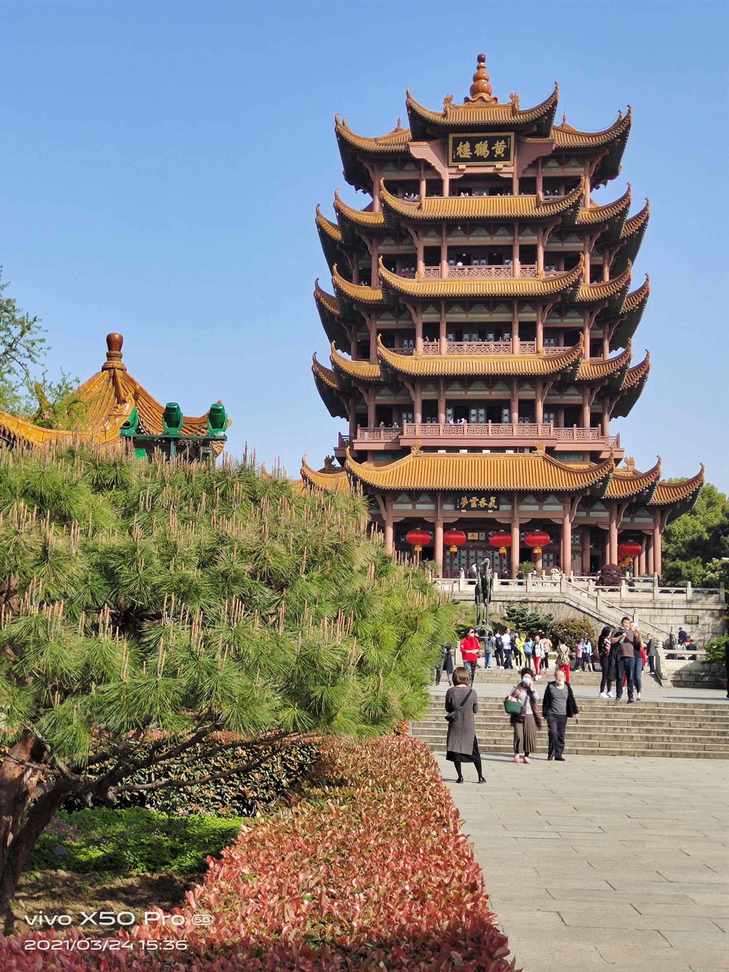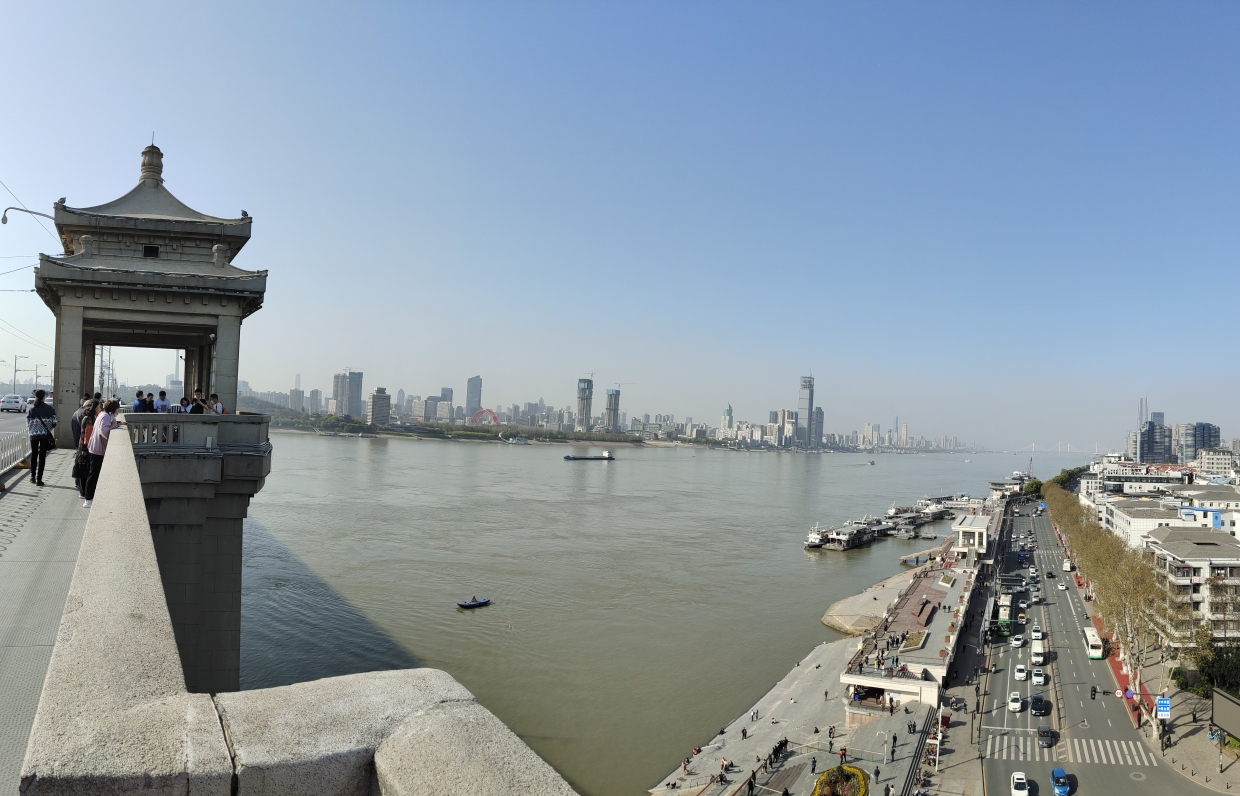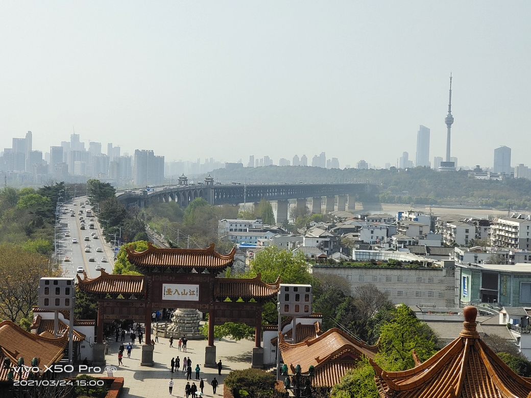 黄鹤楼上俯瞰武汉长江大桥,一边连着龟山(对面),一边连着蛇山(脚下)。这便是风墙动,龟蛇静,起宏图。一桥飞架南北,天堑变通途啊!