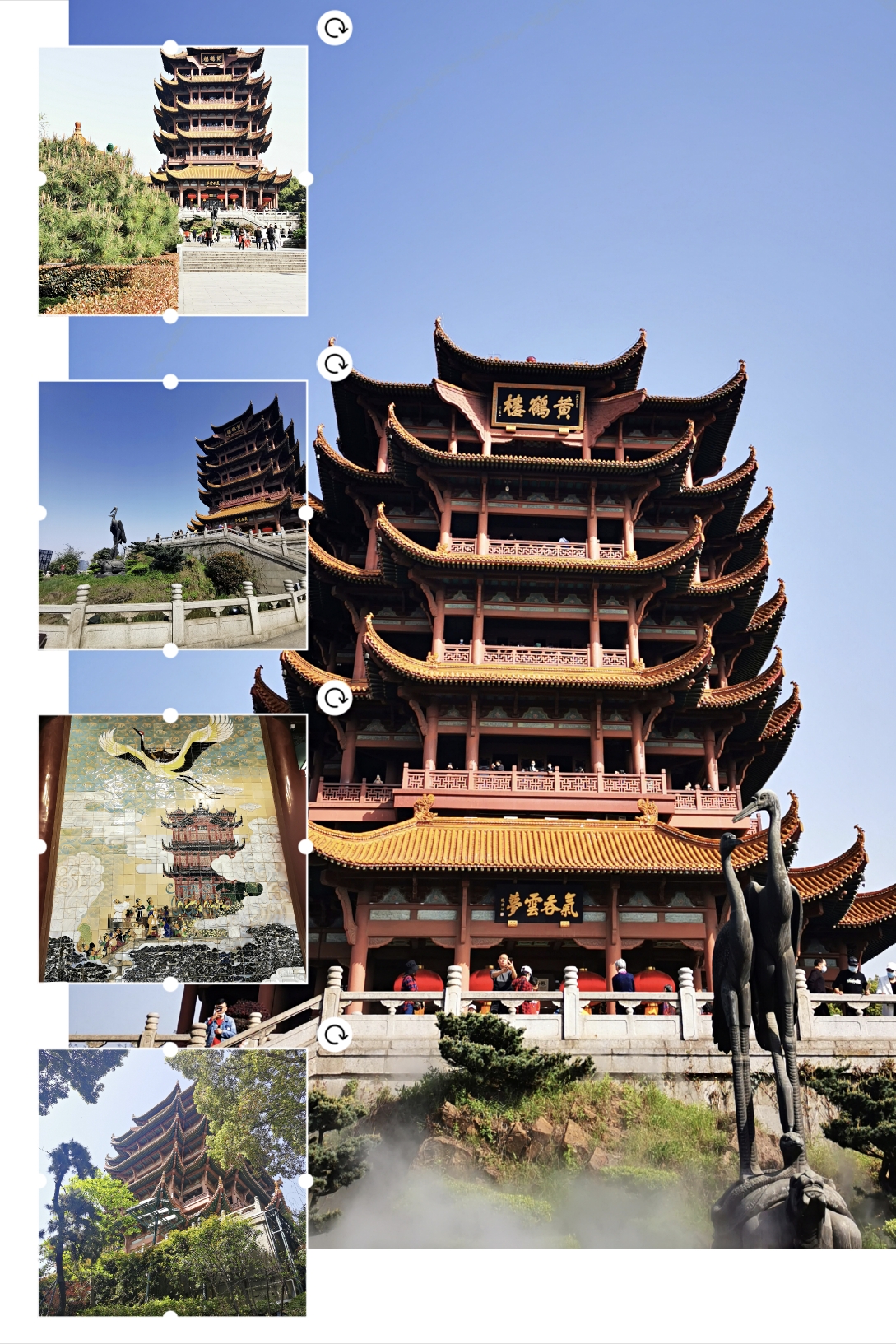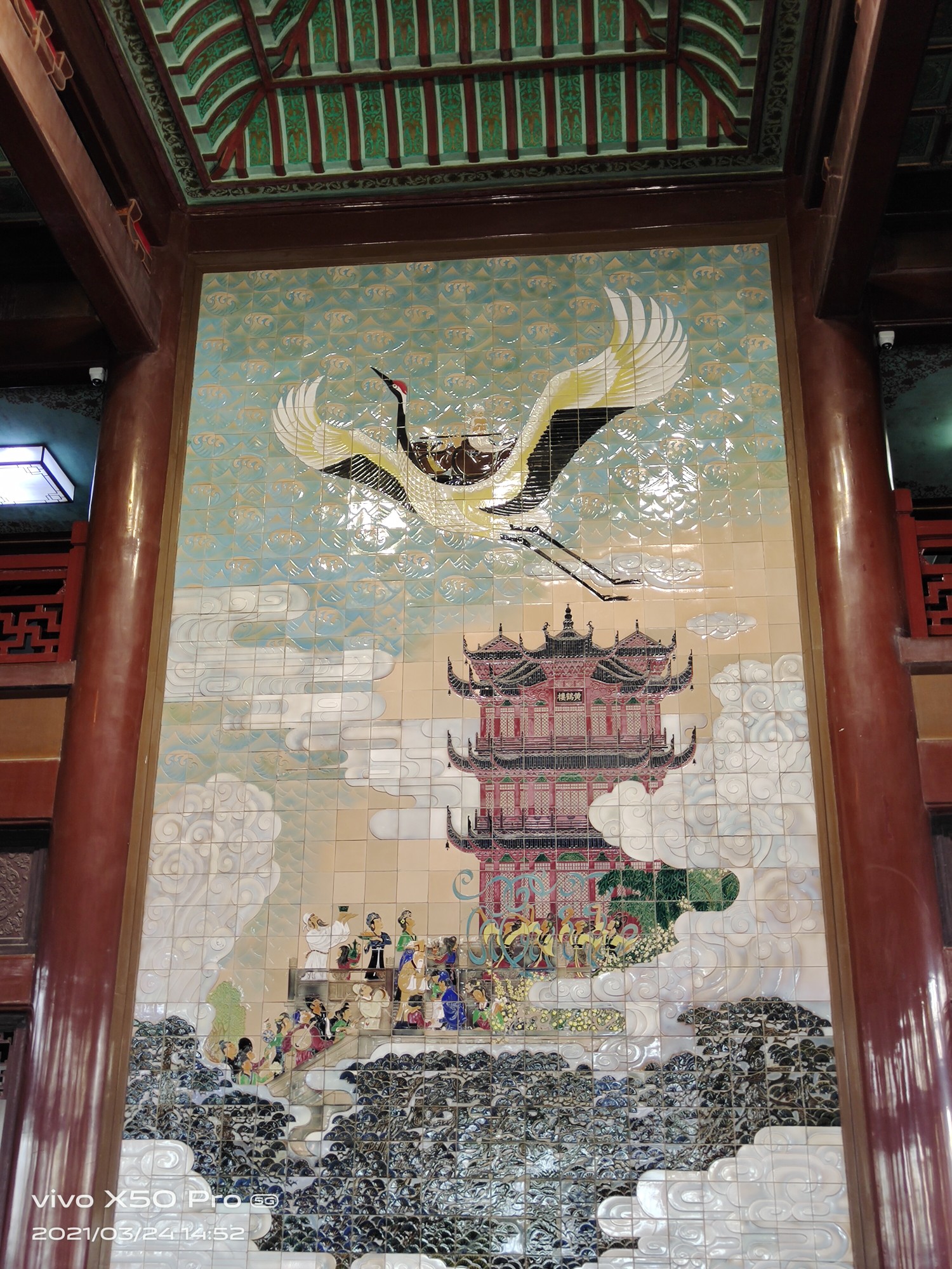 黄鹤楼内景。这层的壁画画的是清代的黄鹤楼。黄鹤楼历史上经过多次重修或重建,谁也不敢说哪次重建的就是标准的。只要那“睥睨江汉,气吞云梦”的气势还在,就是标准!
