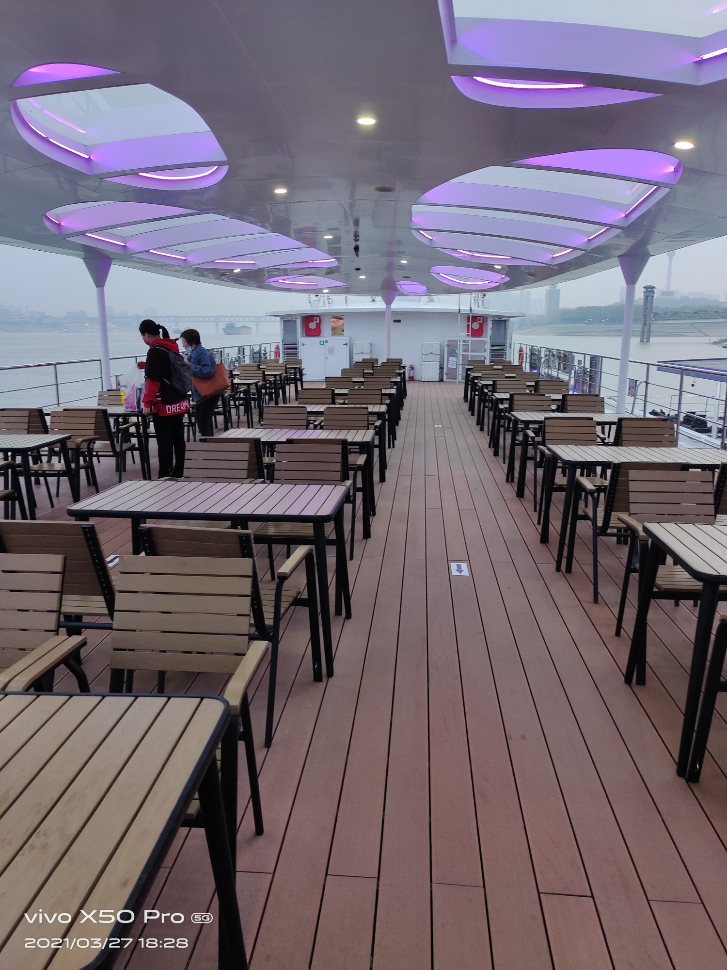 这个高档一点的夜景游船,只有傍晚才开船,船票120好像。船舱里有茶吧和咖啡厅。