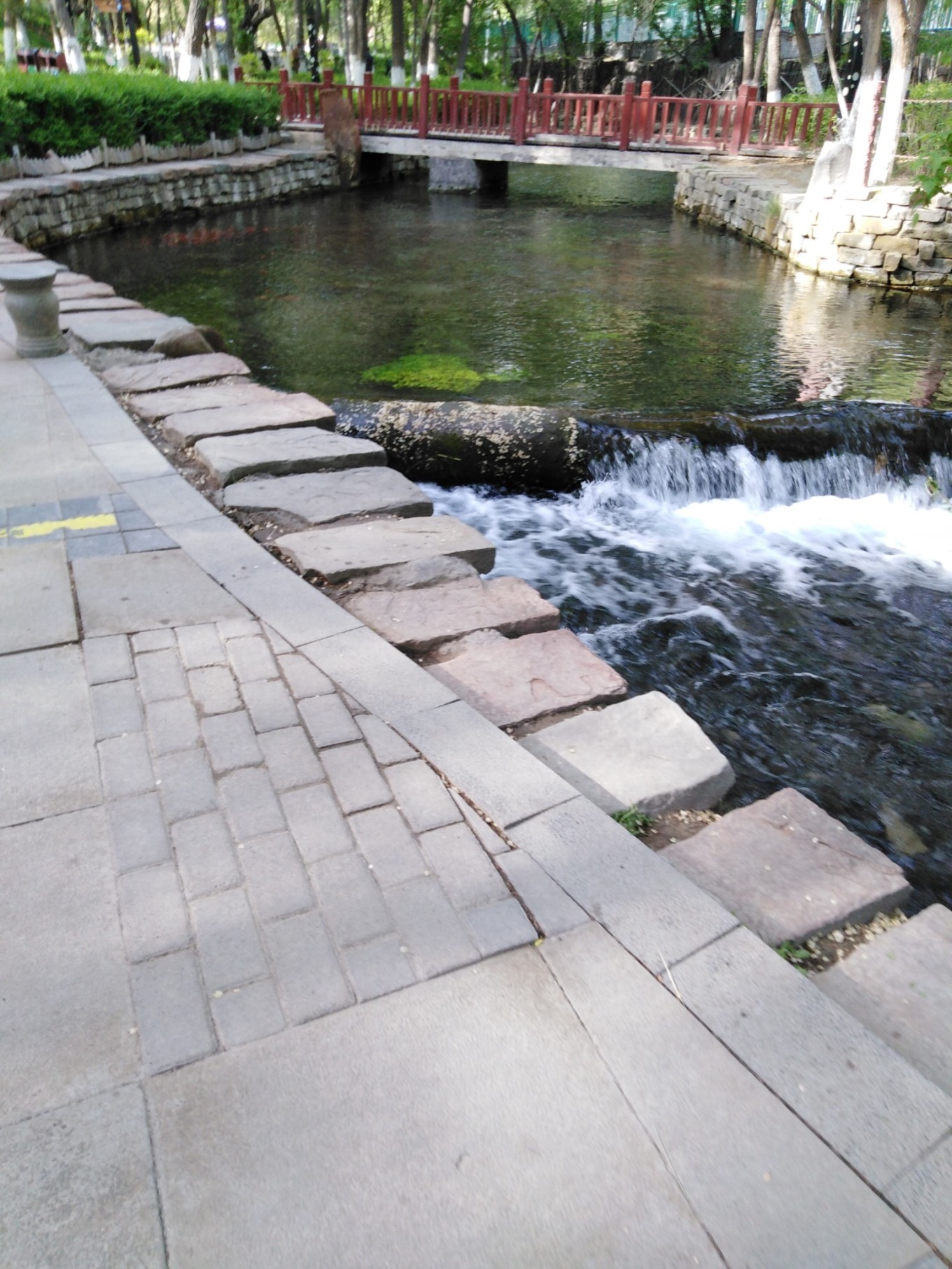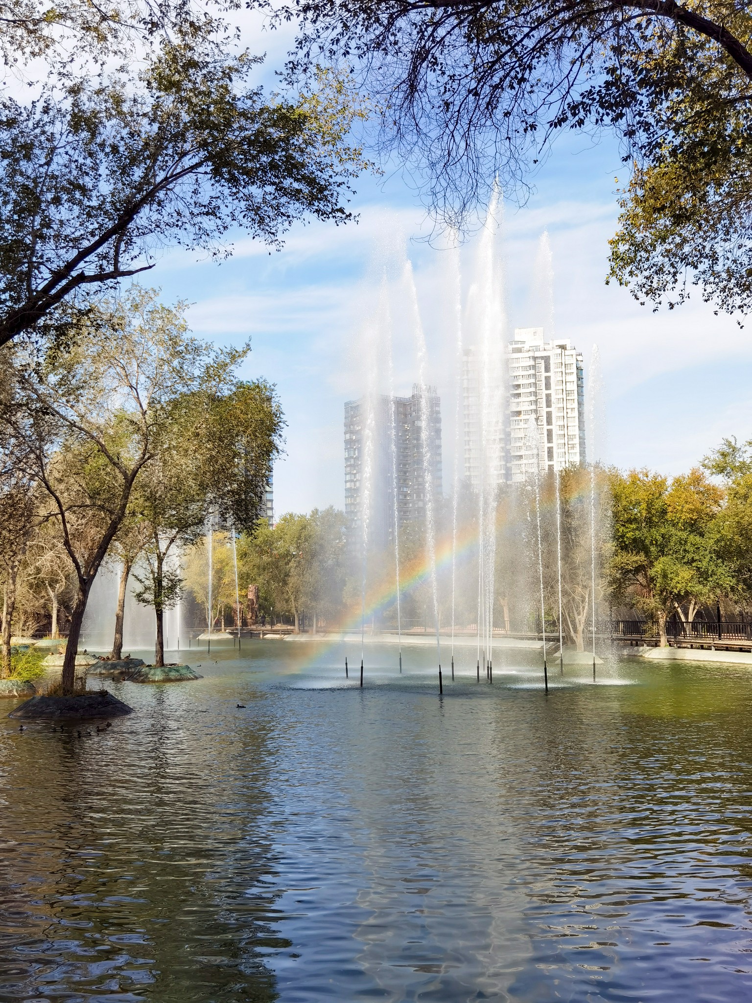 园区一处优美的自然景观,湖面上的喷泉,水柱喷涌居然呈现半道彩虹。