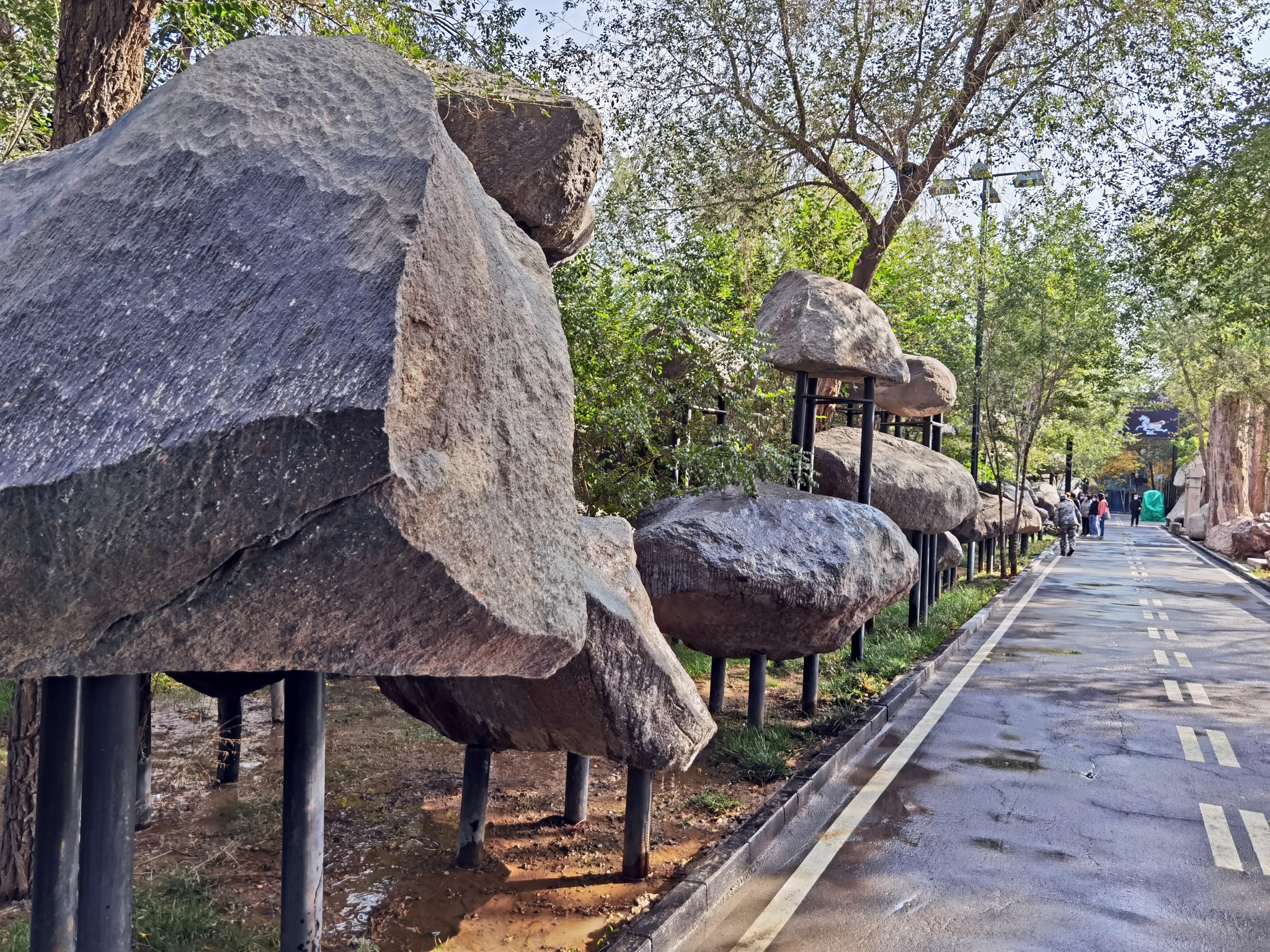 【天外来客“陨石”】在古生态园,还有一个专门展示陨石的区域,那里收集有3000吨来自 阿勒泰 草原的陨石。这些陨石形状各异,均用柱子支撑起来,悬在空中,那么多聚集在一起,显得非常壮观,令人震撼。