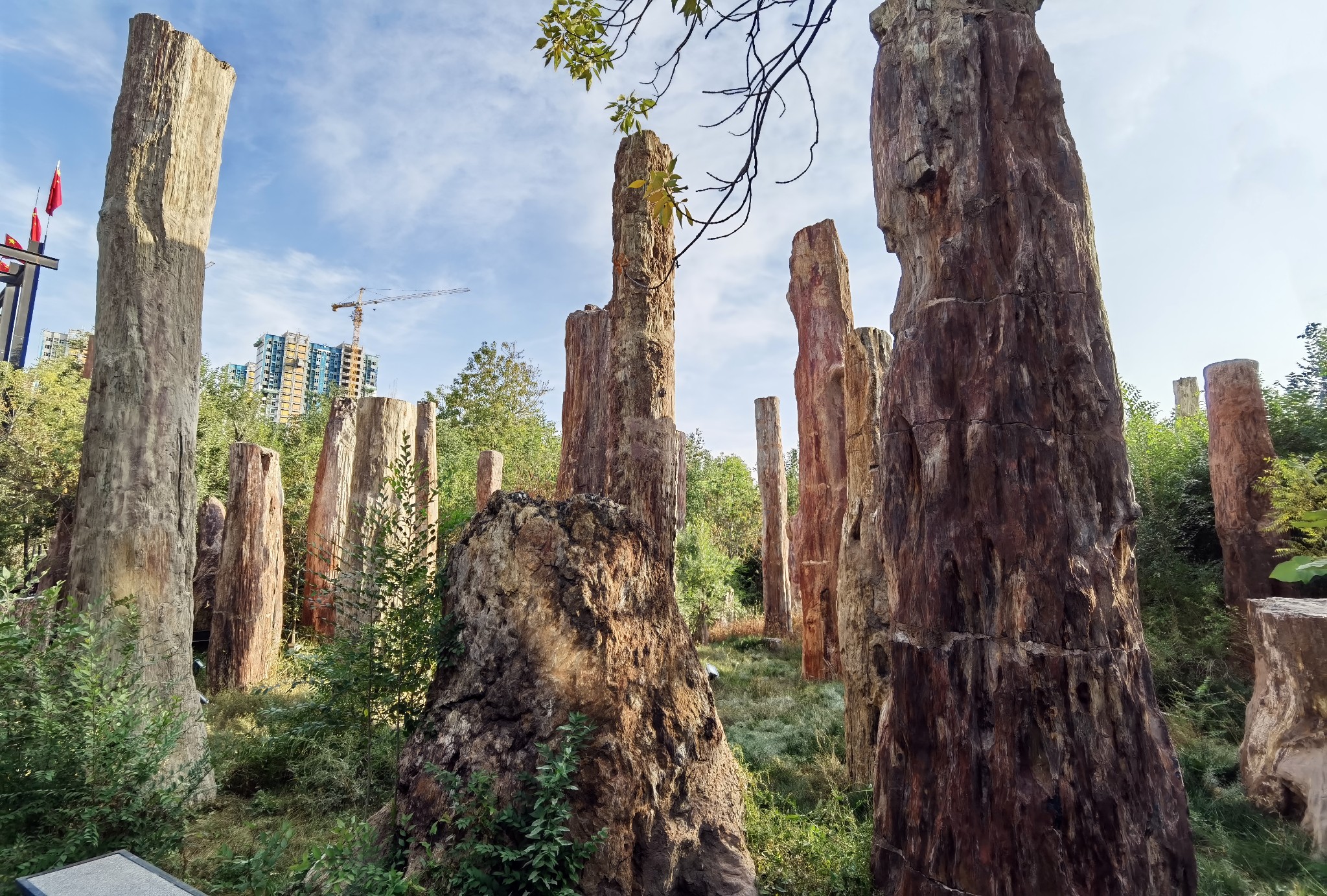 【硅化木林】古生态园的另一处奇景是规模庞大的硅化木群。上百根硅化木,形成了蔚为壮观的硅化木林,其中最长的一根达43米,比 美国 黄石 国家地质公园申报吉 尼斯 纪录的硅化木还要长3米。
