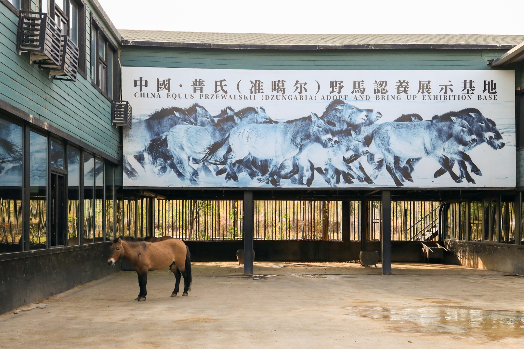 普氏野马生态园内的【普氏野马】普氏野马(学名:Equus ferus、Equus ferus ssp. przewalskii):体长约210厘米,肩高约110厘米,尾长90厘米,体重350千克。头部长大,颈粗,耳比驴短,蹄宽圆。外形似家马,但额部无长毛,颈鬃短而直立。夏毛浅棕色,两侧及四肢内侧色淡,腹部乳黄色;冬毛略长而粗,色变浅,两颊有赤褐色长毛。