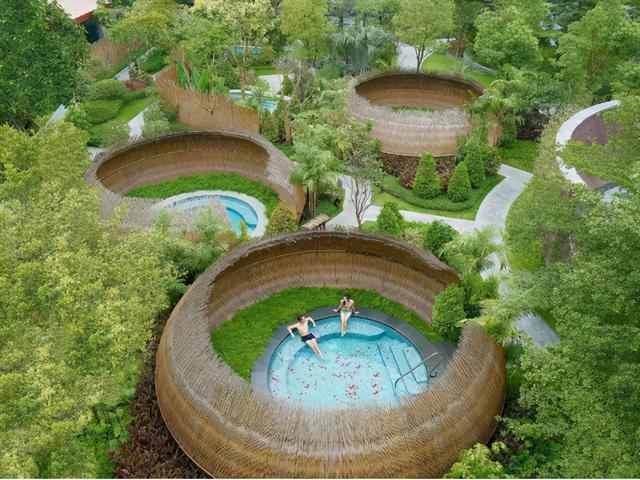 26个露天温泉遍布园林,或建在尖顶的泰式凉亭下,或在翠绿幽静的树木之中。独特泰式风情,拥有泰式 SPA 温泉会所,还有来自泰国的技师,提供专业的泰式SPA服务,每栋别墅拥有独立温泉池。