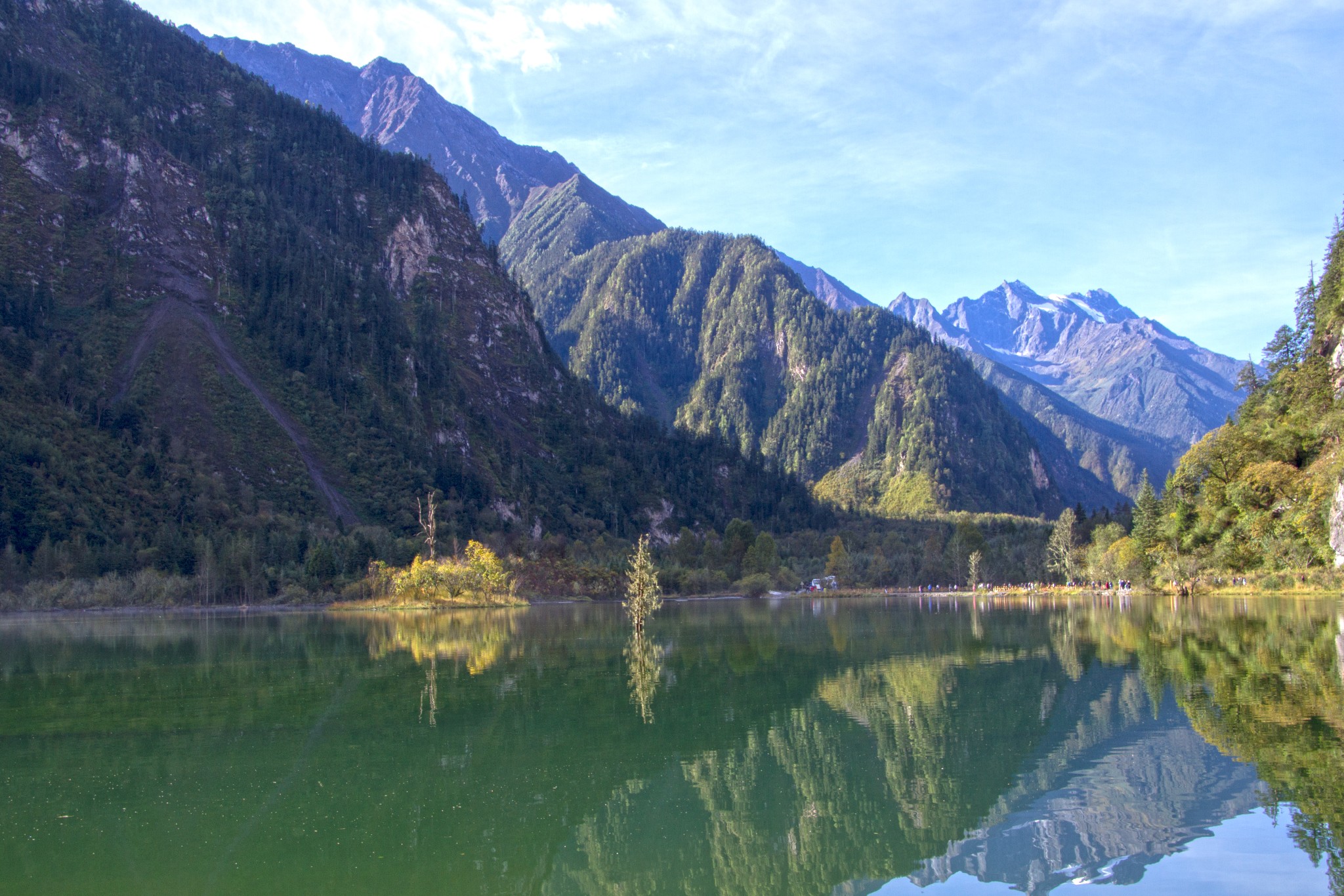 最长的一个海子,长达四公里多,呈墨蓝色,“S”形分布。岸旁林木茂密,一眼望去,水似明镜,巍巍雪峰,沐浴在蓝天白云之中,壮观奇丽。