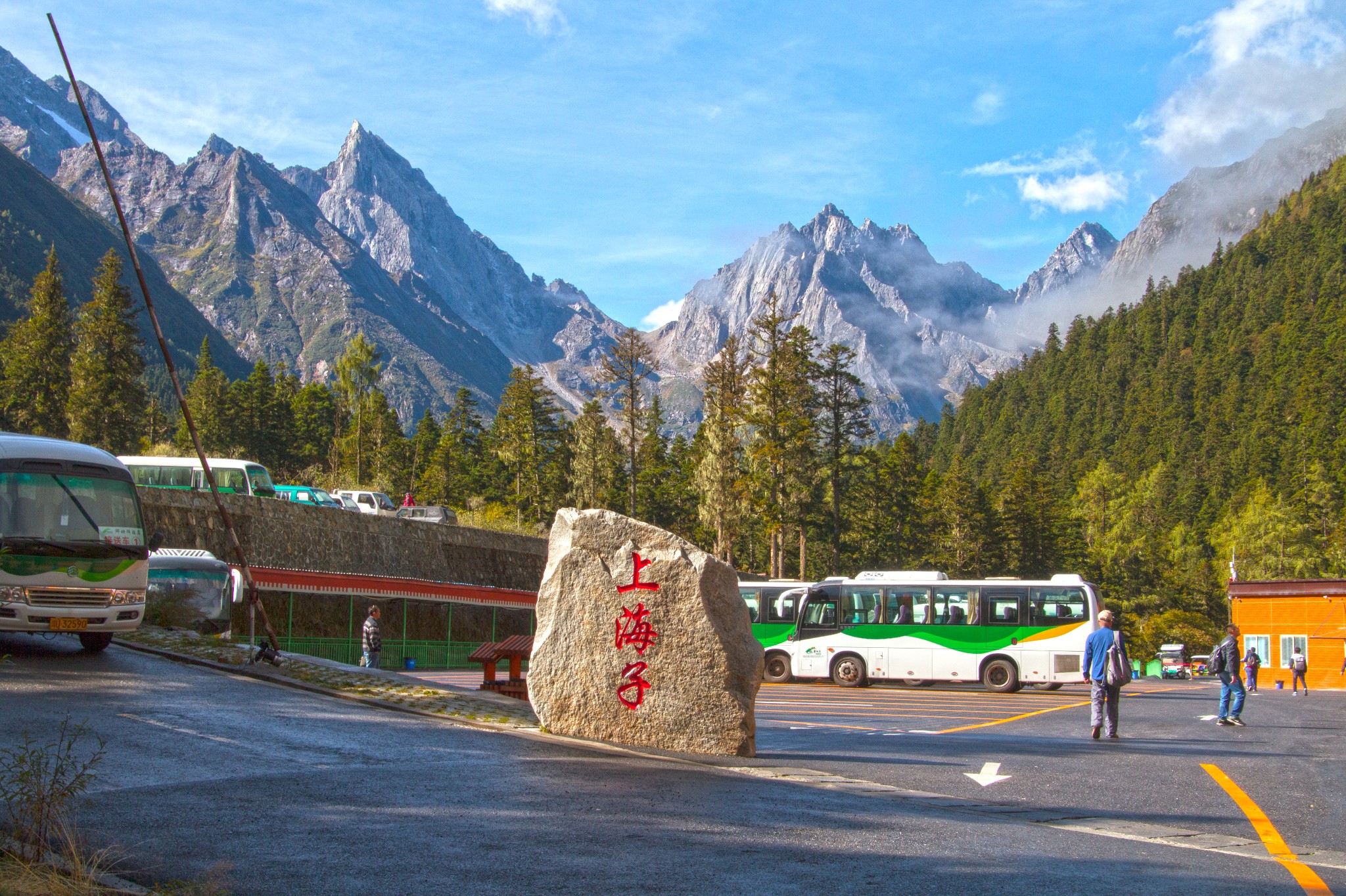 【上海子】是景区景观车的终点站。再往上游览可以选择徒步或者乘坐两段景区电瓶车。我们选择了后者,乘坐景区电瓶车,到达一片山谷“月亮湾”。