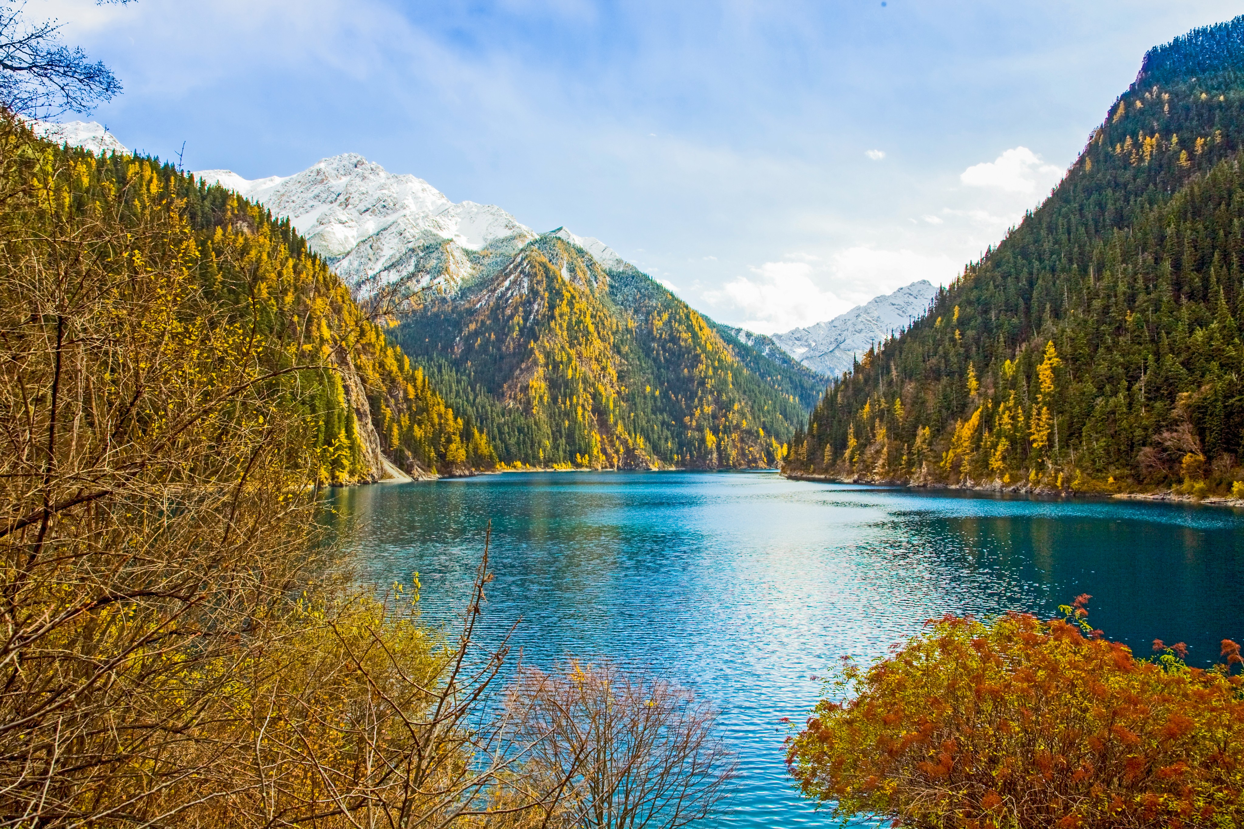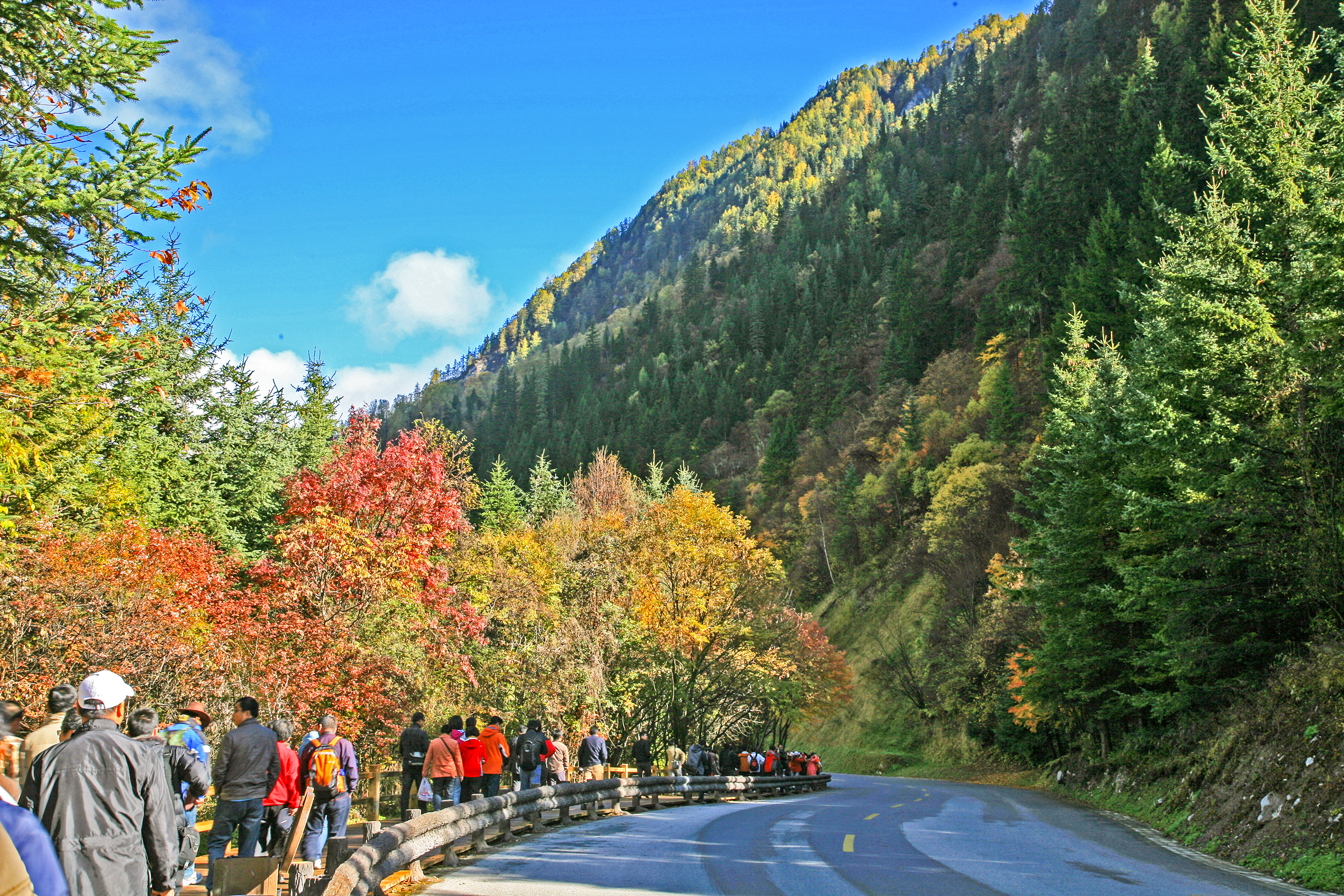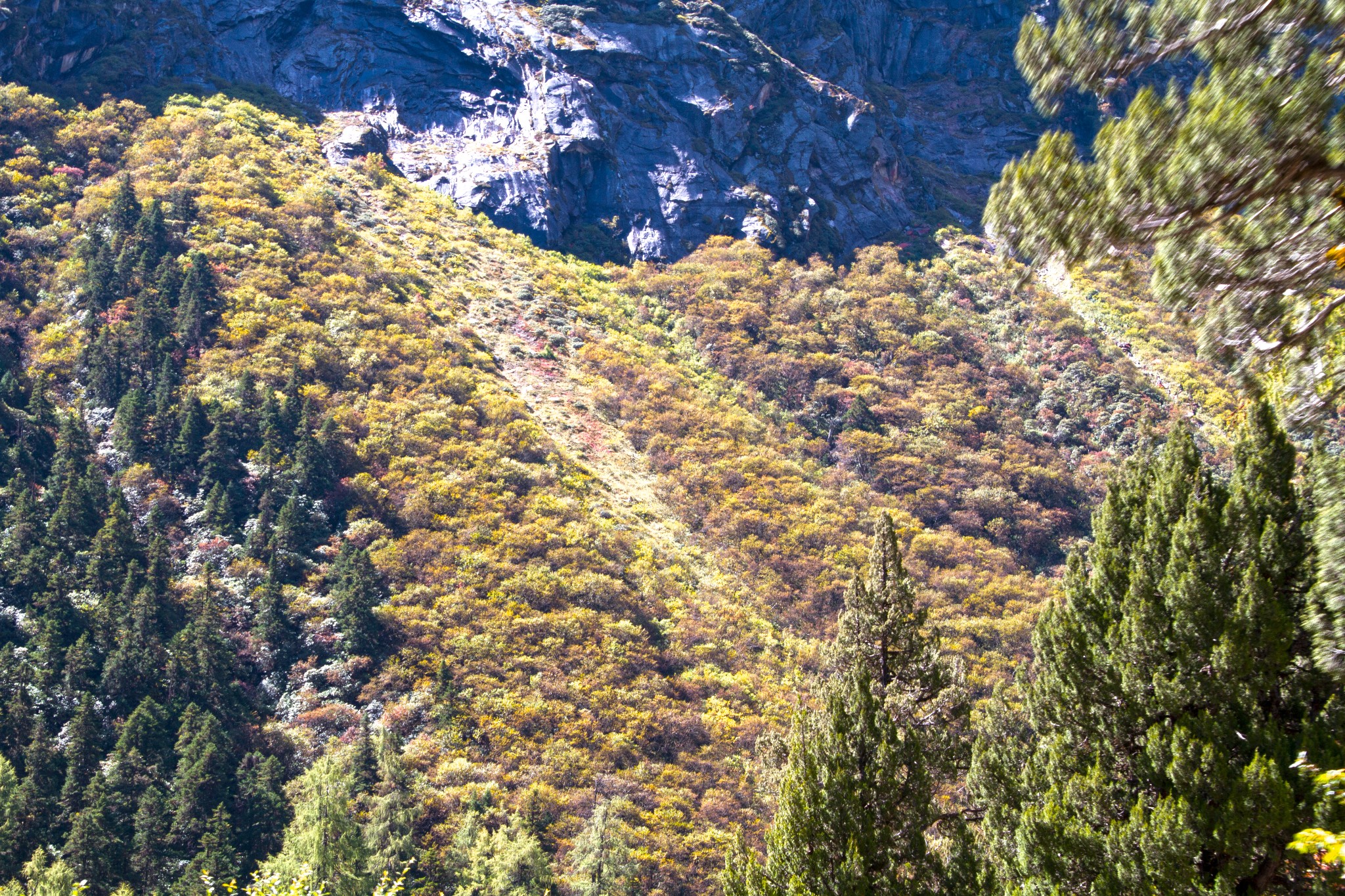 回来的途中,看到对面山坡树木颜色发生了变化,彩林已经有了雏形, 毕棚沟 最美的季节就要来到了。