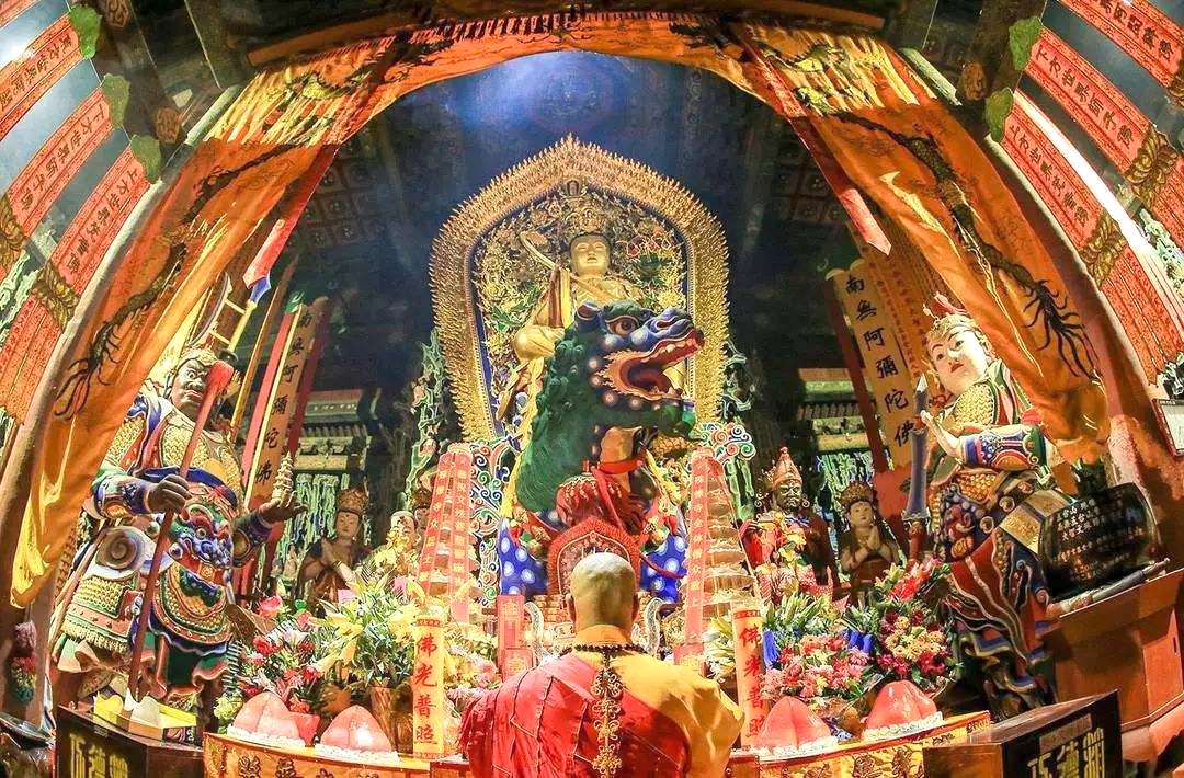 殊像寺大文殊殿中供奉骑狻猊文殊菩萨塑像,高近十米,是五台山最大的一尊文殊菩萨像。