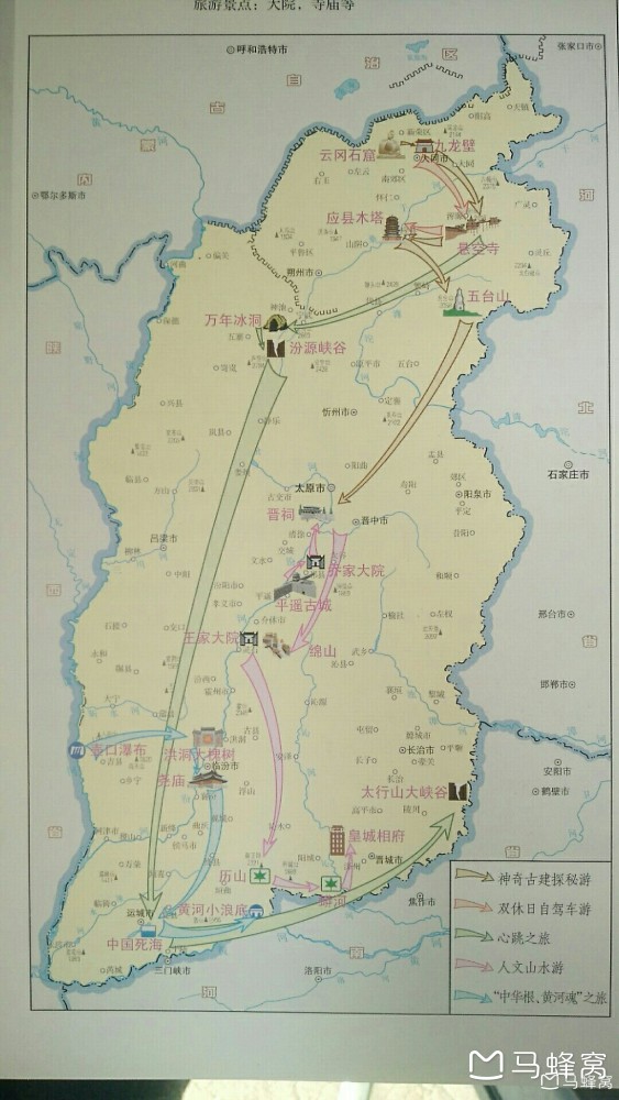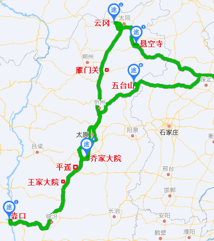 备用线路是反过来走,即第一天到临汾,之后壶口瀑布-王家大院-平遥古城-乔家大院-五台山-雁门关-云冈石窟-悬空寺-保定-天津。