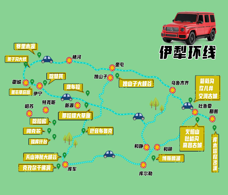 景点规划:第一天:接机,有时间可以去博物馆或者大巴扎逛逛第二天:天山天池-第三天:-赛里木湖--喀赞其第四天:-那拉提,骑马漫步草原第五天:-巴音布鲁克看夕阳下的九曲十八弯第六天:翻越中天山,路旁尽是巩乃斯草原风光,住第七天:吐峪沟麻扎村-火焰山-葡萄沟-第八天:带着满满的手机相册回家咯景点介绍:那拉提:入围全国最美的草原之一并不是浪得虚名,最好登高处俯瞰草原,这就是空中草原的魅力巩乃斯草原:巩乃斯四季景色俱佳,而以春色为zui赛里木湖:大西洋的蓝宝石,雪山,草原,湖泊集为一体吐峪沟:现保存最完整的维吾尔古村落,拍照一流行程亮点:1.本地老司机,活地图,安全可靠2.签订正规国家旅游局合同,不怕被坑3.私家车环湖,不必跟着区间车跑注意事项:1、民族禁忌:是少数民族聚集的地方,有很多少数信仰伊斯兰教,所以来到请尊重少数民族的生活习惯和禁忌;2、适应时差:和内地多数城市有2小时的时差,夏季白天长昼夜短,冬季白天短昼夜长,所以我们在白天不能浪费太多的时间,3、必备物品:早晚温差较大,厚薄衣物均需携带;4、必备药品:根据您自身的身体状况,请携带你所需的必备药品:腹泻、感冒、止血、创可贴等药品;5、必备设备:请携带适当摄影器材:三脚架、充电器、备用电池、偏振镜、广角镜头、长焦镜头、照相机防护套等;6、生活必备:请携带洗漱用品、防晒霜、剃须刀、防护紫外线的飞巾
