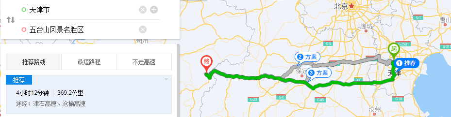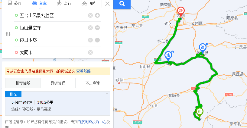 出发先到达五台山比较好,五台山您最好安排2天时间,算上路程时间也有1天半的时间。五台山核心景区在台怀镇。这一带5座如台山峰相连,故名五台山,东台望海峰、西台挂月峰、南台锦绣峰、北台叶斗峰、中台翠岩峰,主要游览各个寺院,五爷庙、菩萨顶、黛螺顶、塔院寺、罗睺寺、显通寺、圆照寺、菩萨顶等等。