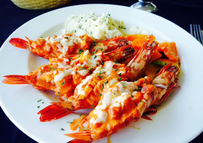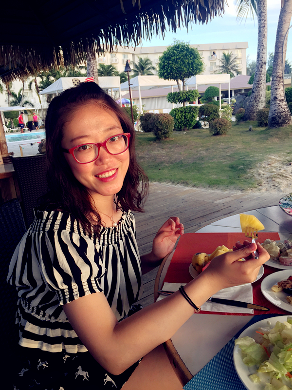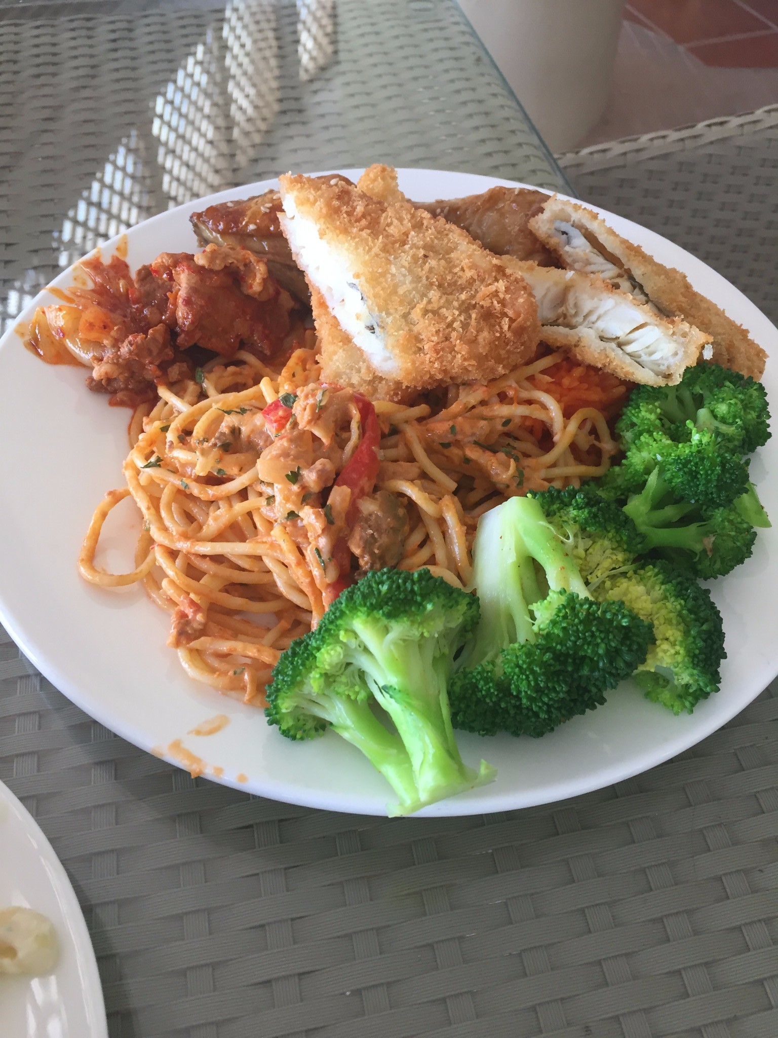 然后顶着烈日到商店里买了一瓶110倍的香蕉船的防晒霜(知识点:攻略里面已经明确的告诉我们了,110的香蕉船是人手必备的,现在有两种,一种是喷雾状的,12刀左右,一种是膏状的,10刀左右,最后两个都买了,个人觉得喷雾的不怎么好用,)心想:趁老婆睡醒之前,准备好一切,简直是贴心如我啊。这一觉就睡到了中午,午饭是在酒店的餐厅吃的,第一顿一定要吃好吃饱吃倒,秉着这个原则,我们这是没少吃啊~~