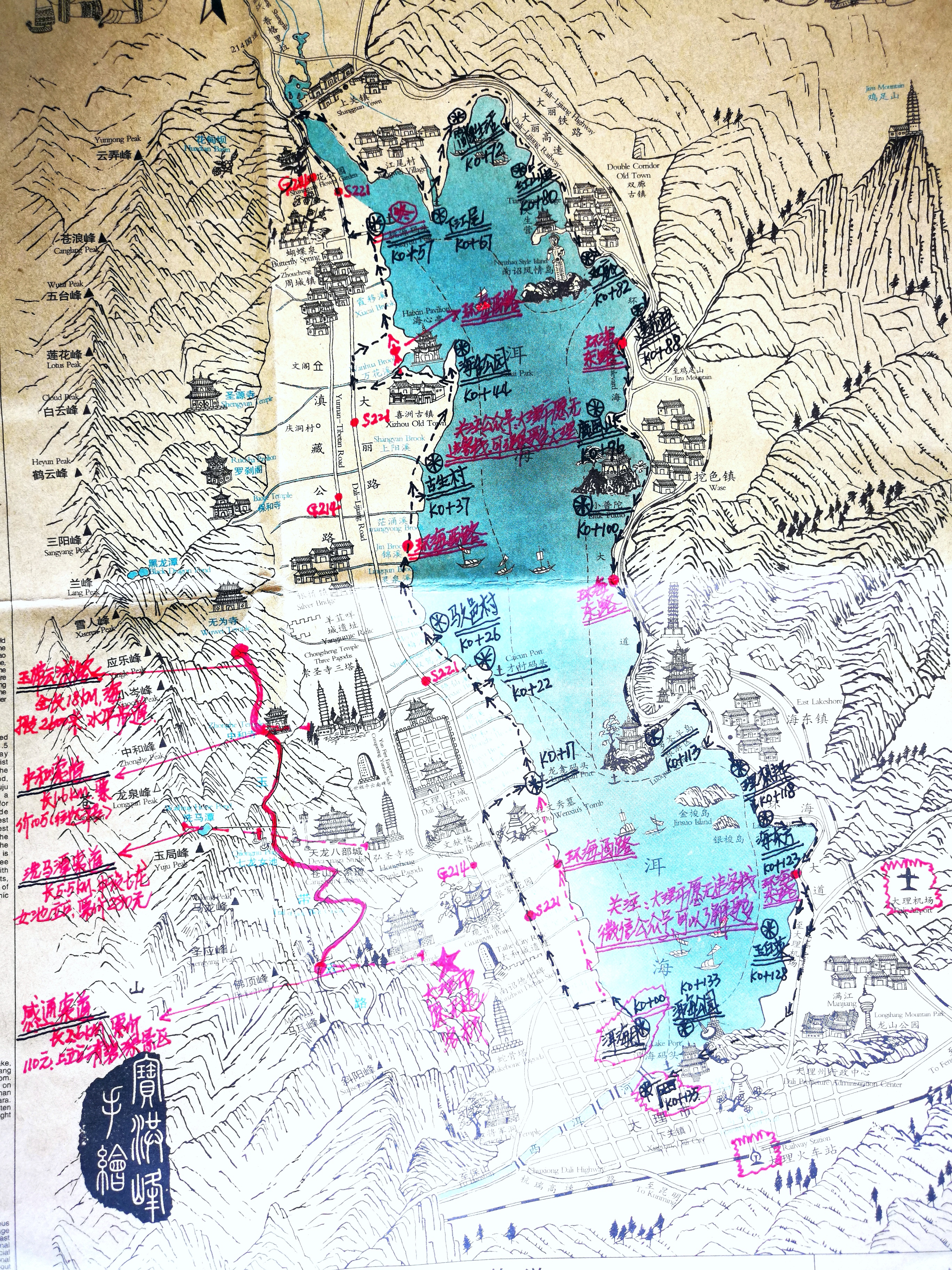 总的环洱海骑行线路图如下,图上所标注的里程及地名,就是2019年8月12日,我们一天骑行环洱海的内容。