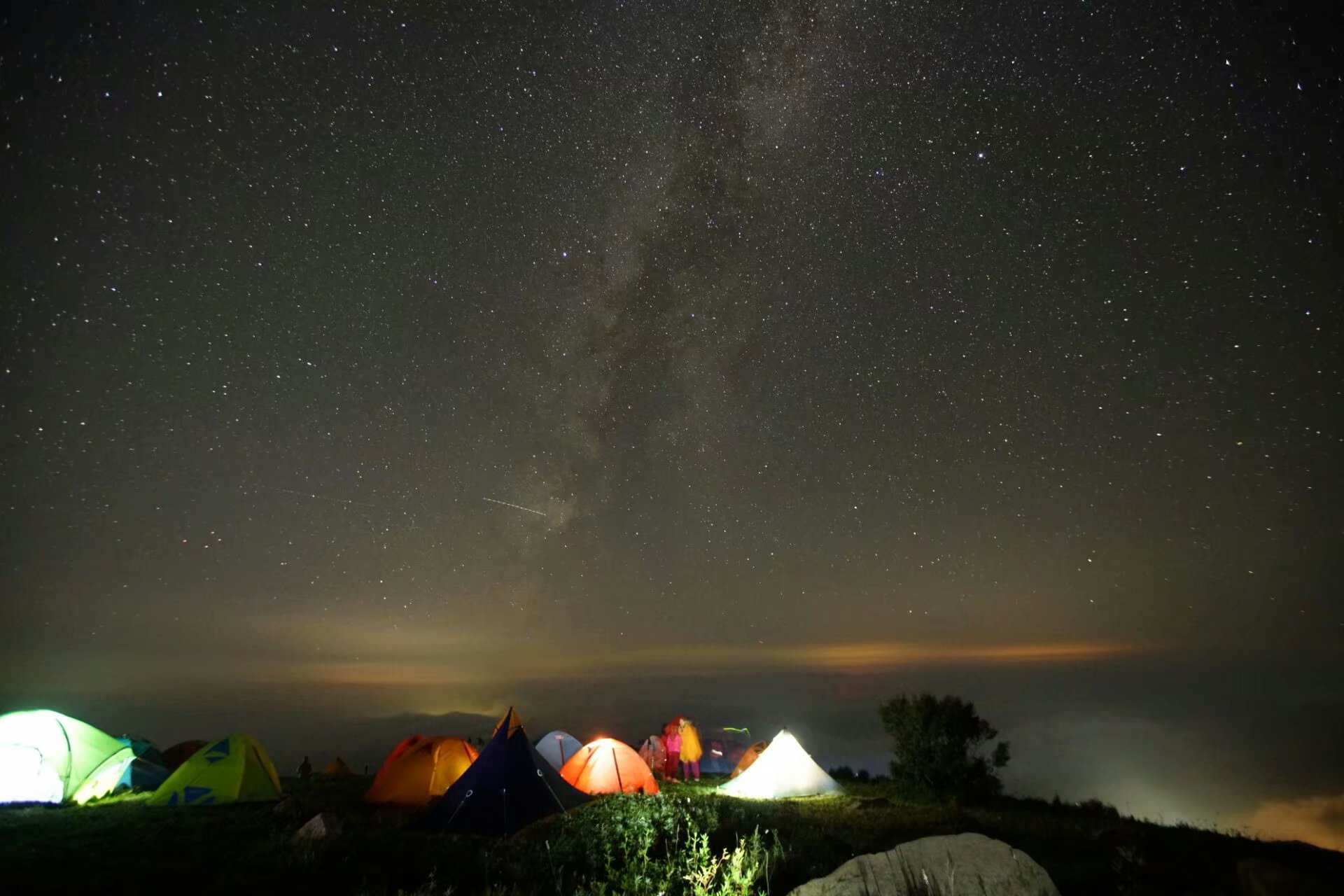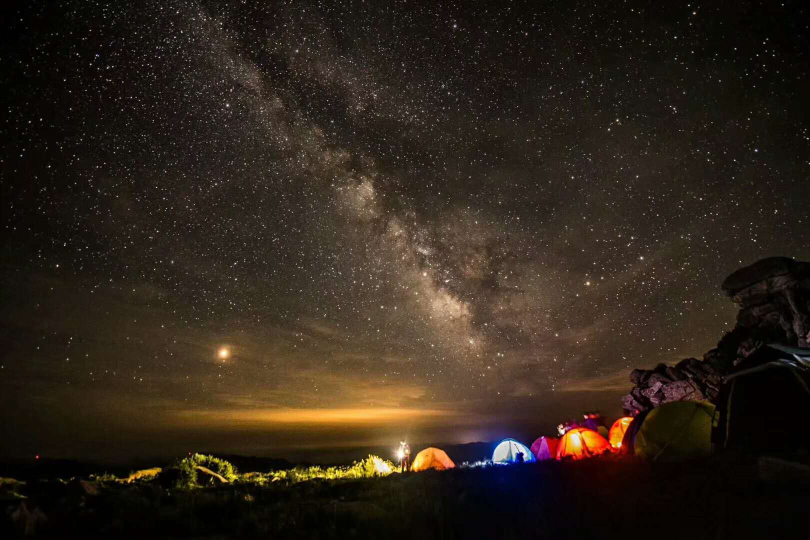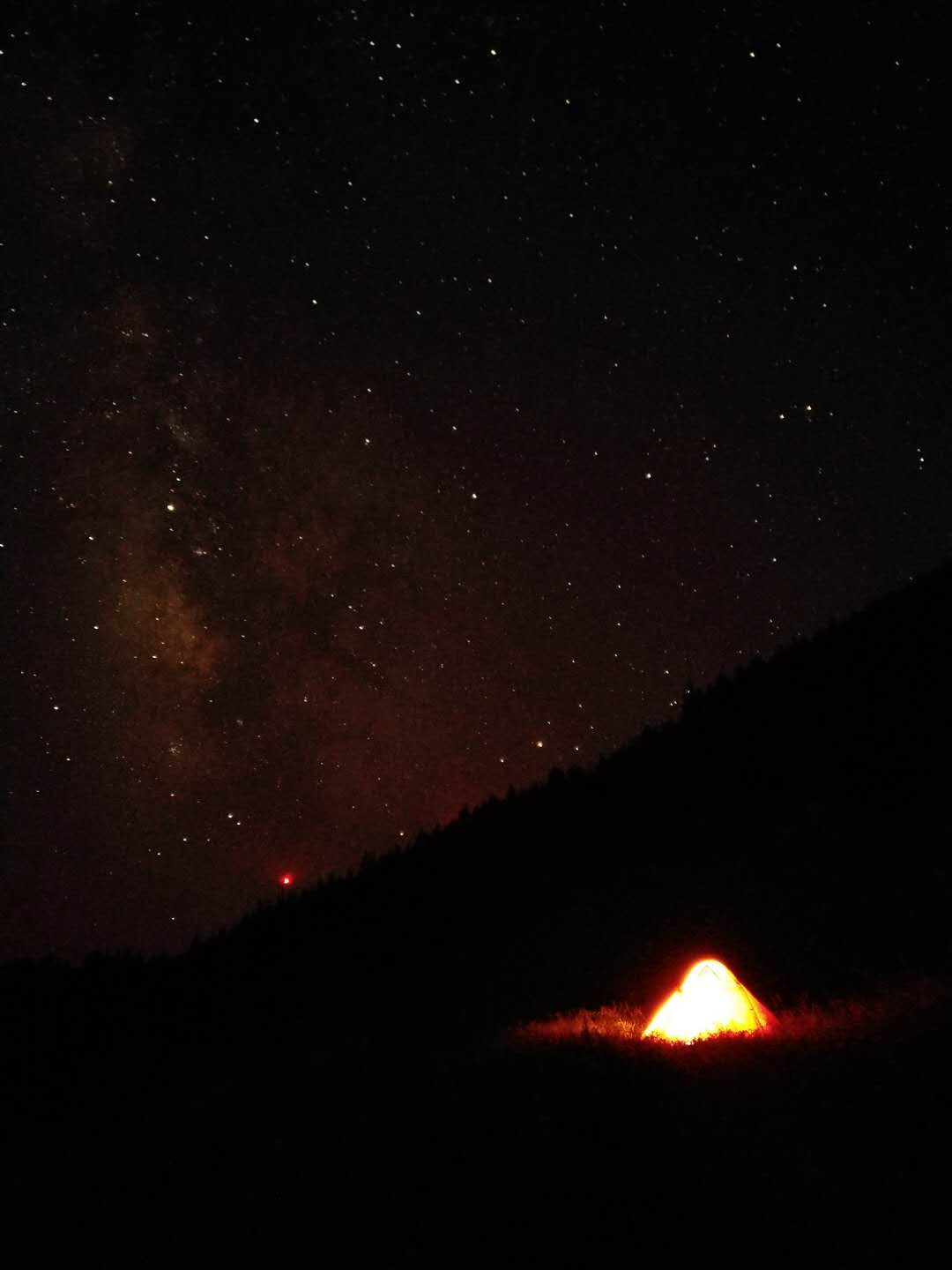 灵山最美的拍星星的地方是东灵山,但东灵山不适合太多人扎营,几个人去还行。一般驴友灵山露营是从塔尔寺上北灵山,然后走到无名一和无名二一带露营,那边也是不错的拍星星的地方。灵山露营体力要求比较高,去之前需要有充分的准备。