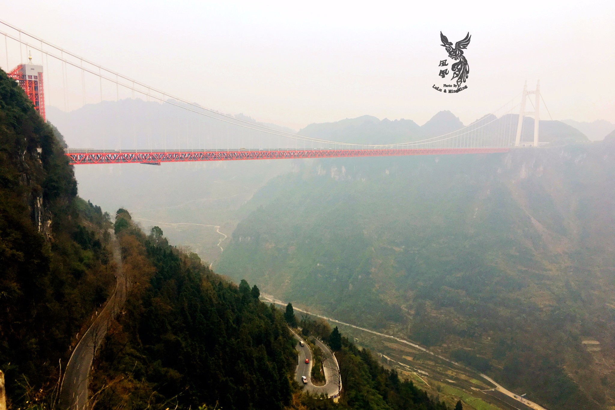 又不知拐了多少个弯,忽见大桥侧面,路上有一个观测点,可以看到矮寨大桥全貌。红色的桥身,悬挂在峡谷之上,十分壮观和险要。矮寨特大悬索桥位于湖南省湘西州吉首市矮寨镇境内,是国家重点规划的8条高速公路之一——长沙至重庆通道湖南段吉(首)茶(峒)高速公路中的重点工程。悬索桥的主跨为1176m,桥面到峡谷底高差达355米,两岸索塔位置距悬崖边缘仅70至100米。