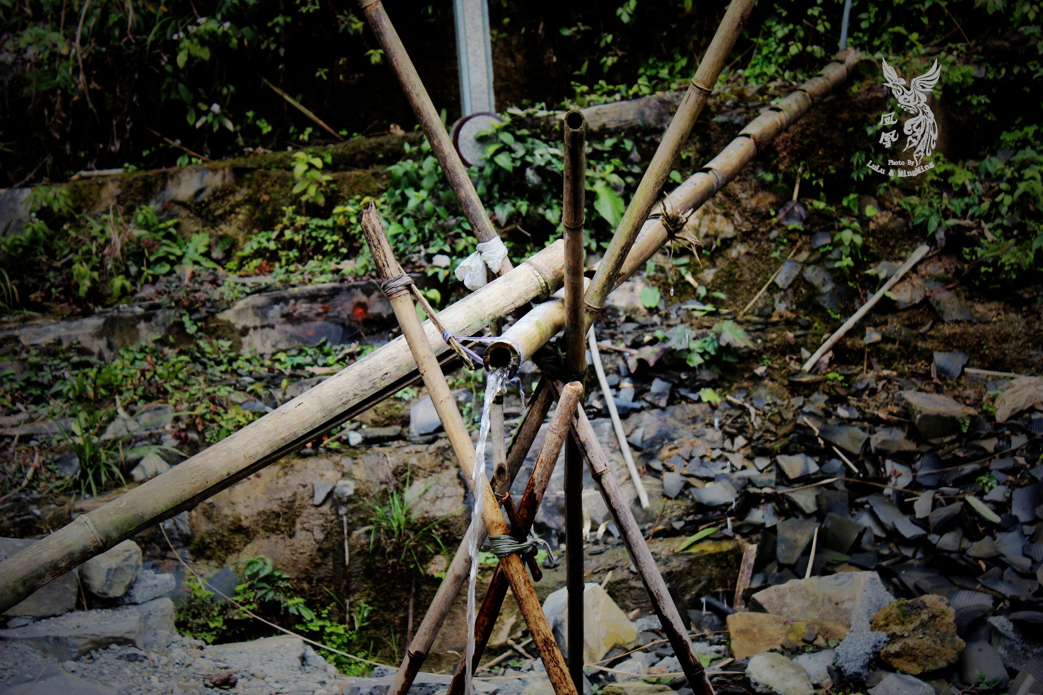这里水资源充沛,山上不断有水流淌下,用柱子做成的引流工具。
