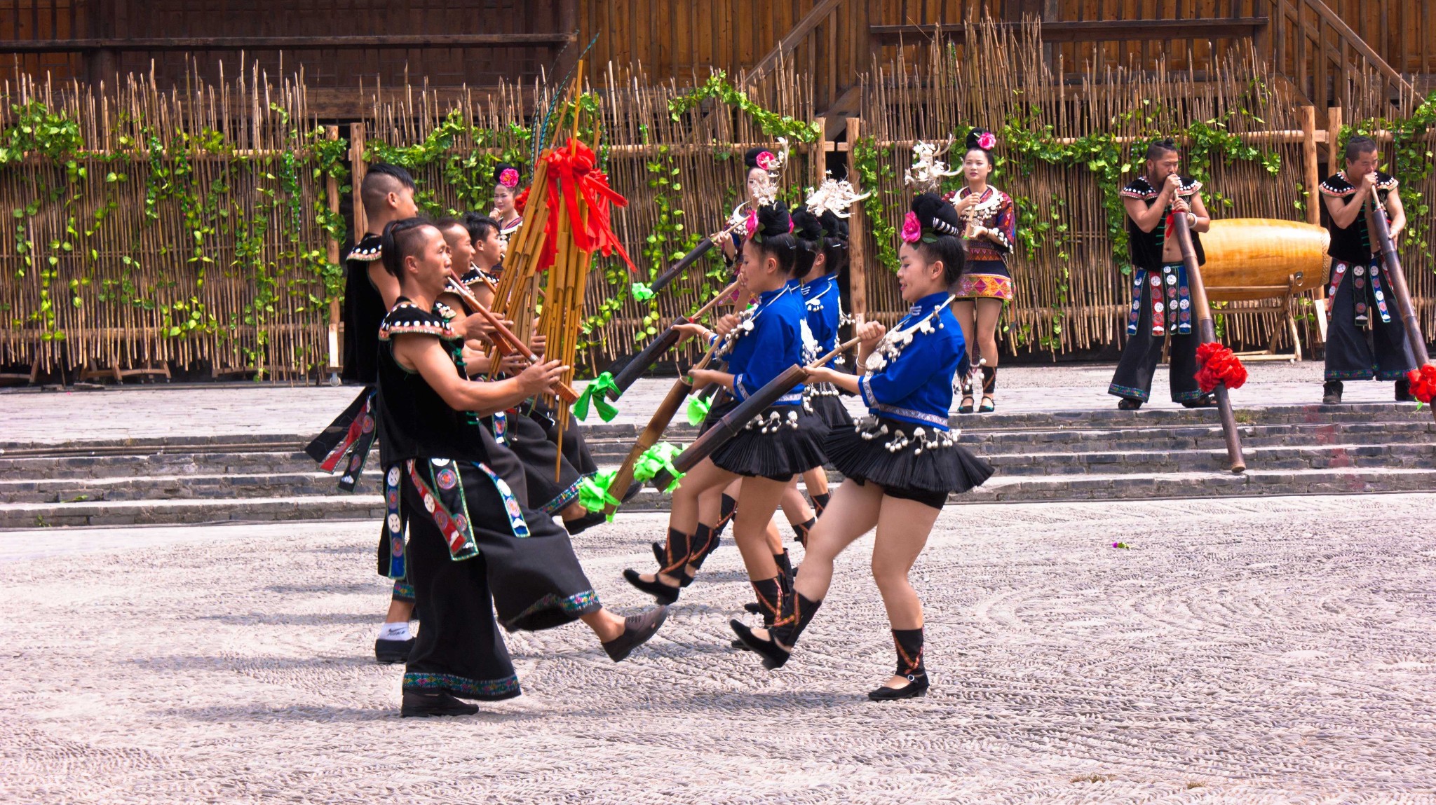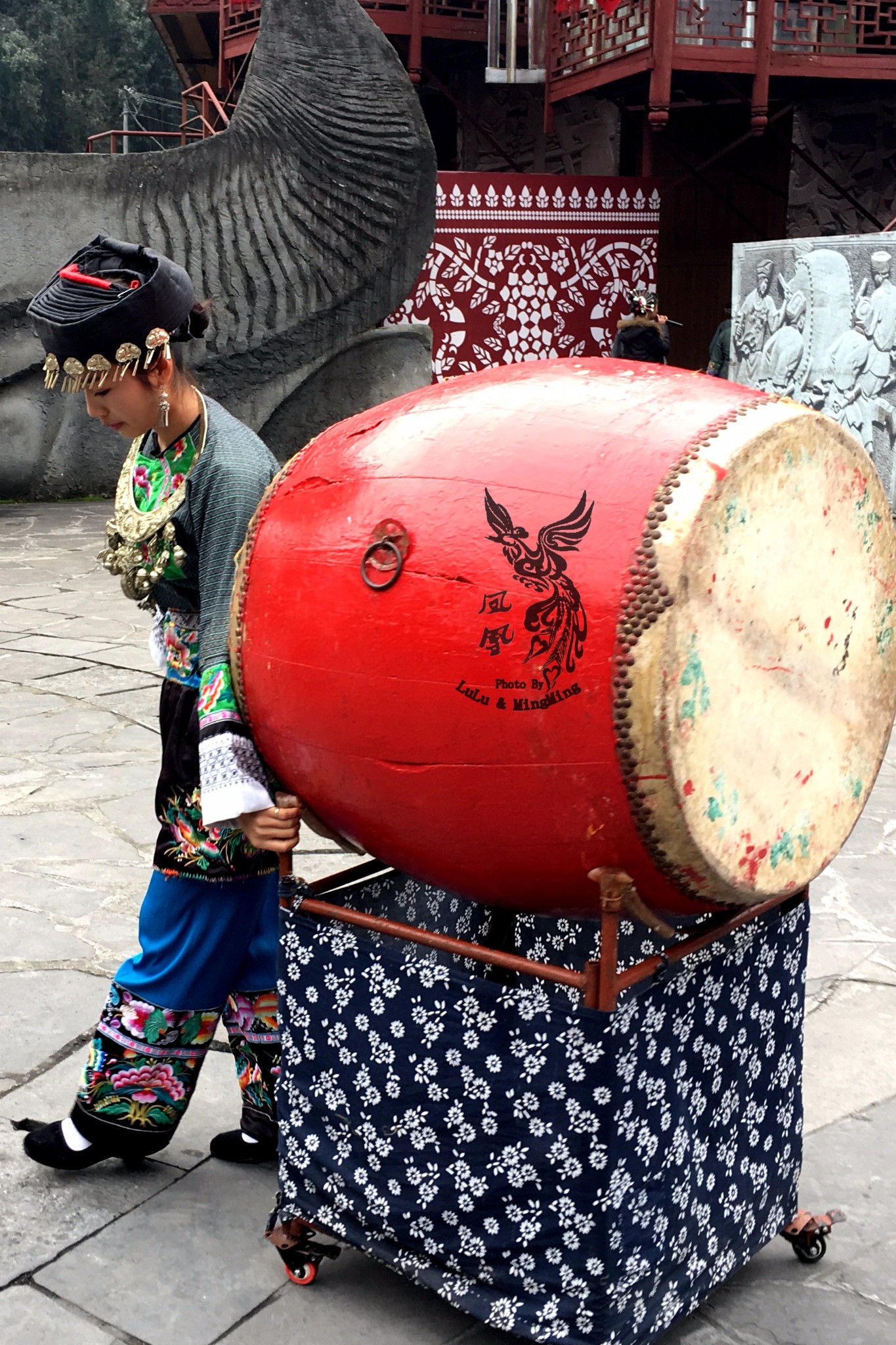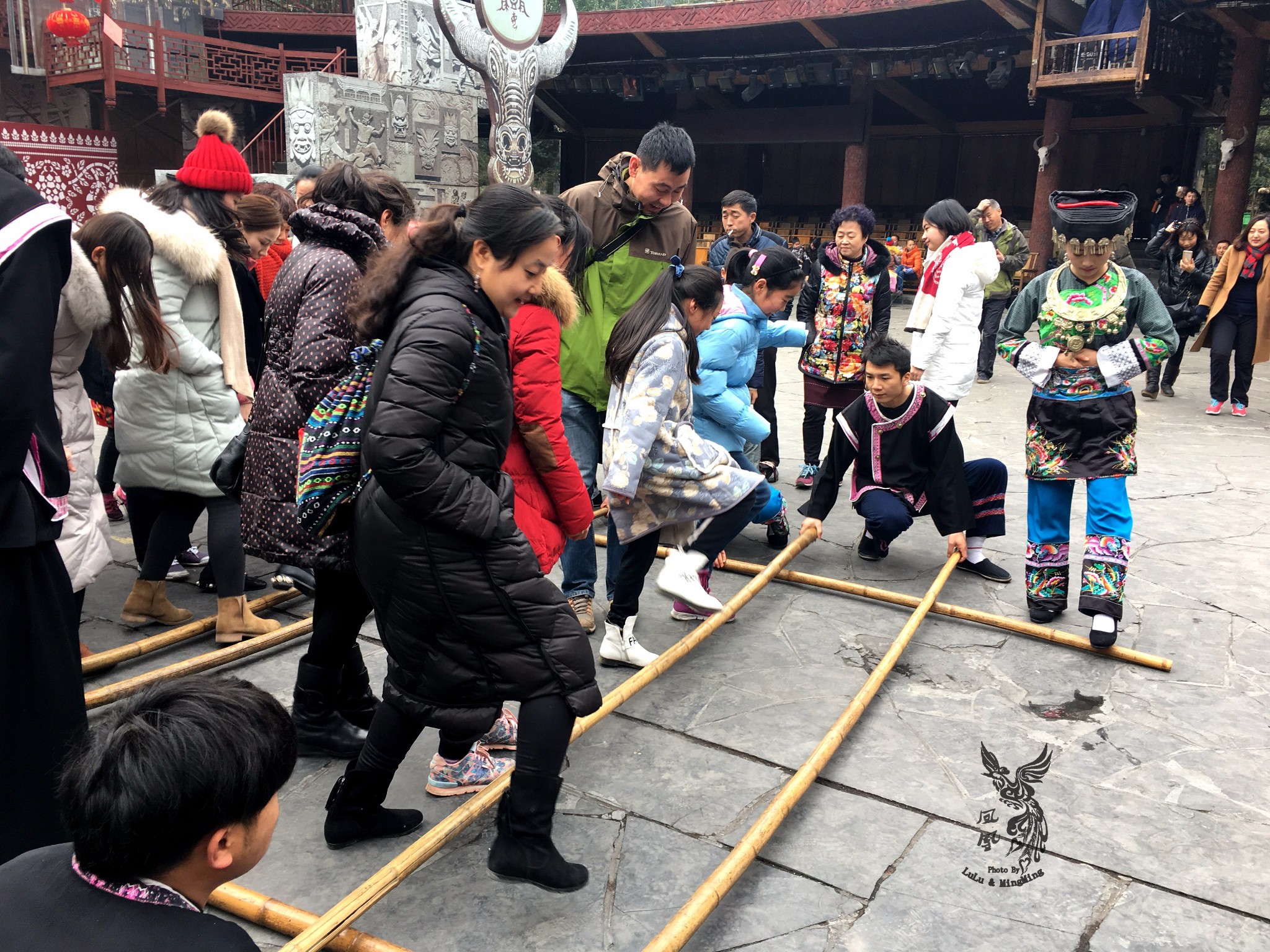 先是到了一处苗族民俗特色表演的场地,几场演出后,游客体验跳竹竿。湘西的德夯苗寨尤善鼓乐,有“天下鼓乡”美誉。历史上苗族擂鼓原为部落征战时传送信息的手段,意在召集人群和激励斗志,随着社会的进步,独特的苗鼓艺术转为典礼、节日欢庆之用,苗鼓已成为族群圣物和部落标志。