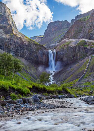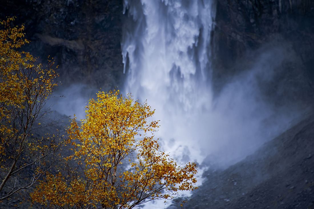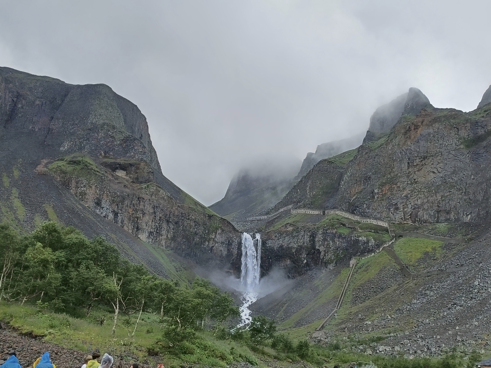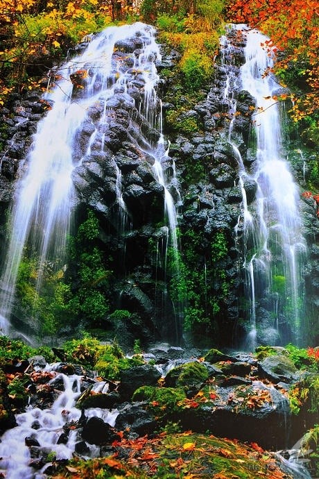 泉水飞泻在磐石上,经过两次跌落再汇成巨流,由悬崖直泻谷底,总高约70米。水声震谷,惊心动魄。这种阶梯式的瀑布,也称双叠瀑布,很有特色。