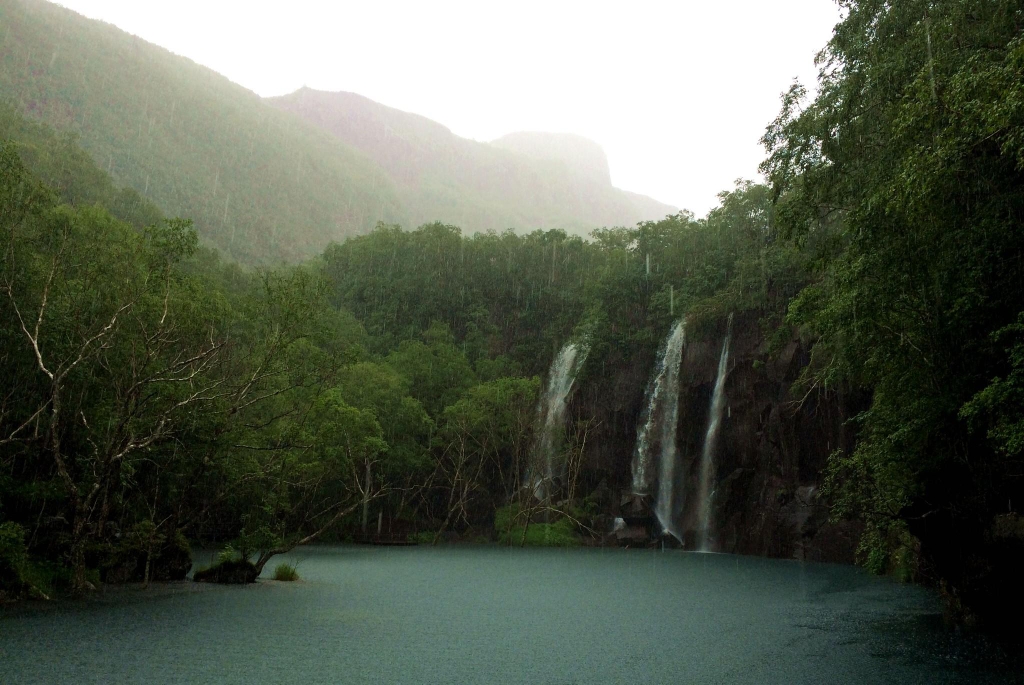乘槎河流到1250米处便形成落差为68米的瀑布,由于山大坡陡,水势湍急,一眼望去,就像一架斜立的天梯。瀑布口的"牛浪渡"巨石,将瀑布分成两股,两条玉龙似的水柱勇猛地冲向深深的谷底,溅起几十丈的飞浪,犹如天女散花,水汽弥漫如雾,瀑布挂在群峰竞秀的半壁天堑上,蔚为绮丽壮观。