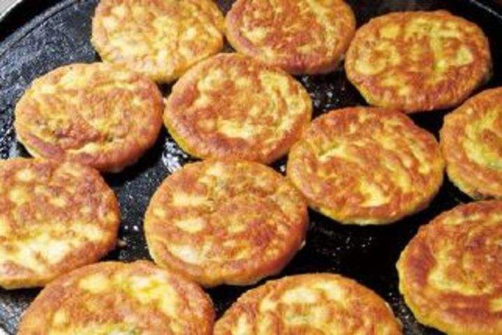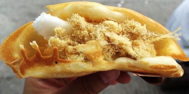 用鸡蛋和面粉在火炉上烘煎而成的半圆形糕点,可添加芝麻或辣椒、三鲜、果酱等馅料,更是口味丰富。正宗的蛋烘糕外脆内软。