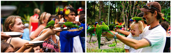 的野生动物能够与人和谐相处,从蠢萌的迷糊考拉到食肉的恶魔袋獾,再到优雅高傲的食火鸡,都是一派悠闲的生活状态。栖息地最著名的体验服务就是与吸蜜鹦鹉共进早午餐。