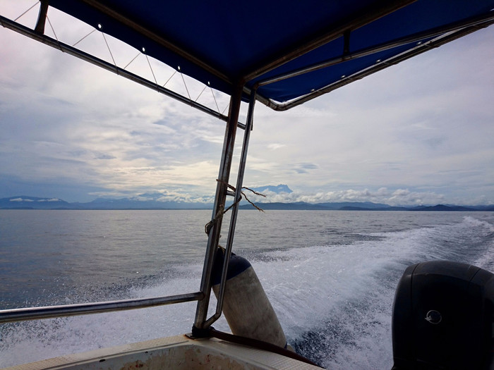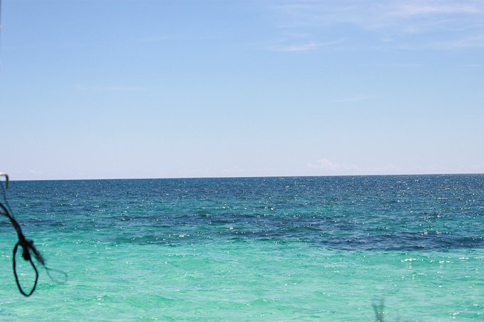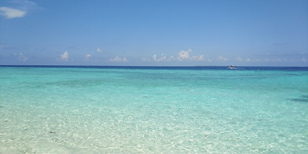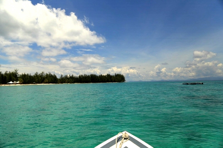 大约过了四十分钟,我们靠近了一处海岛,岛的一角海面是浅蓝的颜色,与周围海域有明显的颜色分界线。绕过转角,我们渐渐靠近