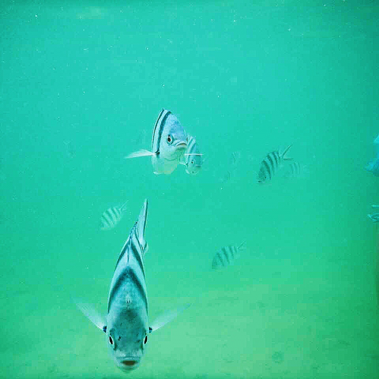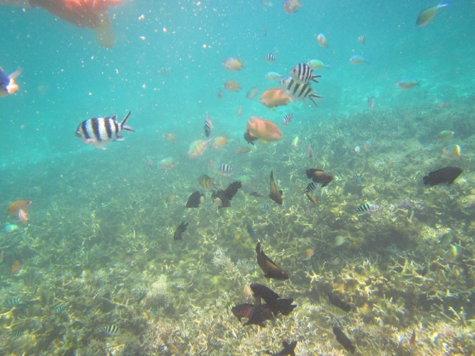 快艇停了下来,浮潜海域水深大概5、6米,在 日光 强烈的关照下,清可见底,我穿着早早换好的泳衣,带着面具,还有氧气罩跳下了海。调整好泳镜和呼吸管,我慢慢地把头潜入海中,看到了许许多多不同颜色的小鱼,手机可以装进提前备好的潜水袋里在水下拍摄,不过还是建议租水下相机拍得更清晰。原谅我拍不出海底的美丽