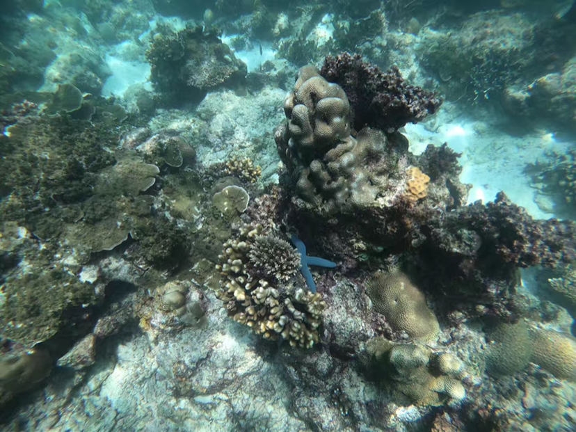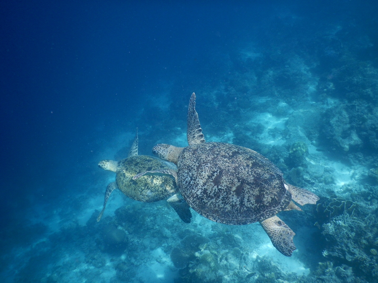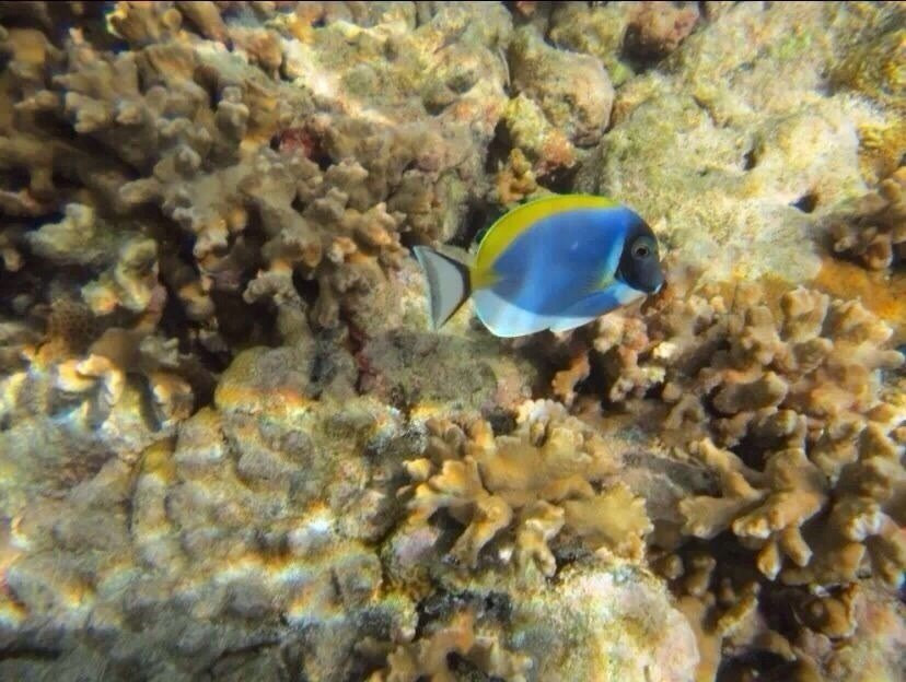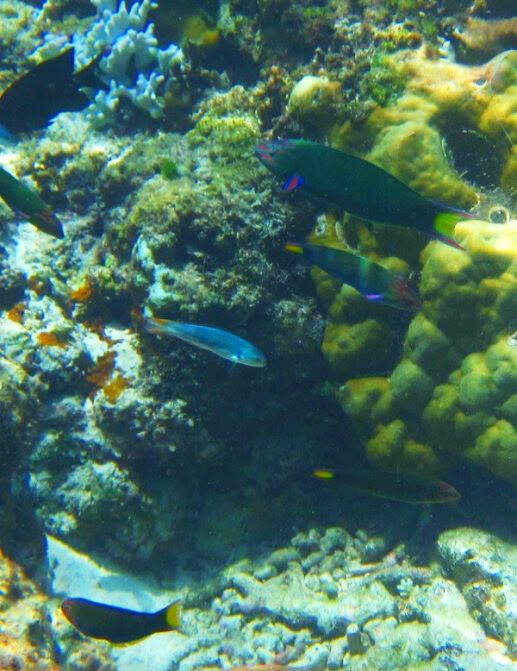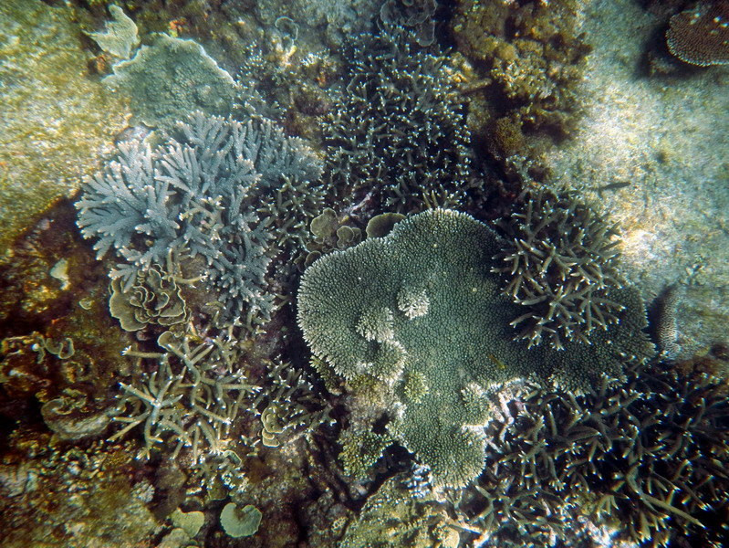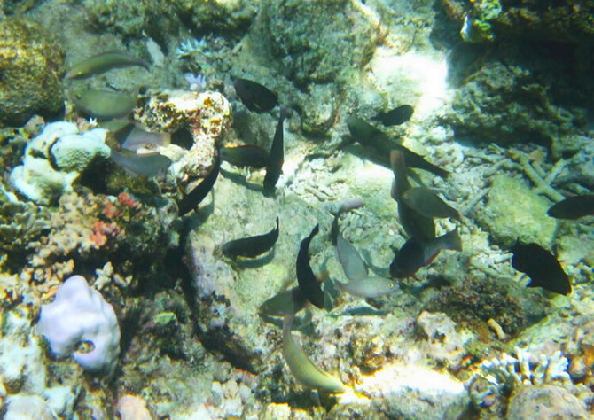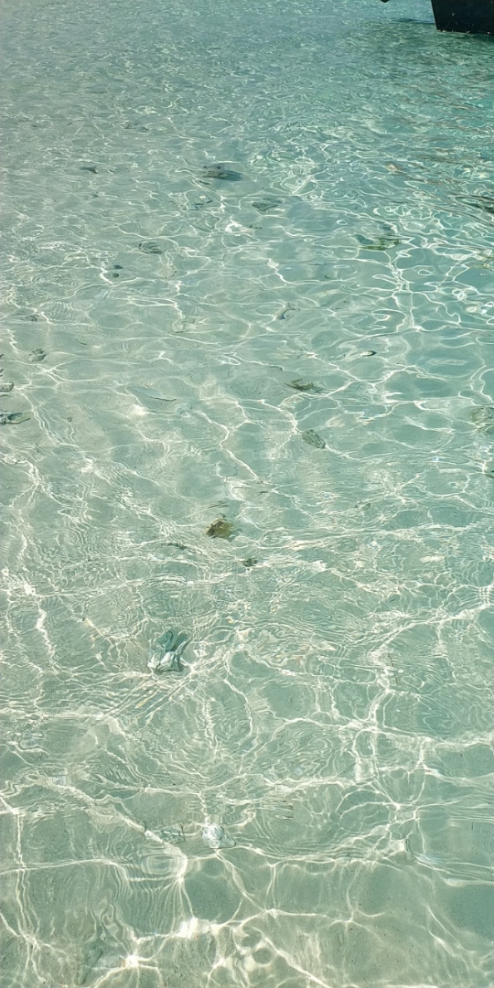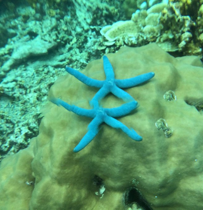 试过明白,所谓Snorkeling只要把脑袋浸到 水里 ,没有空气的折射可以欣赏到美丽的海底世界。橡胶的脚蹼很管用,保护脚丫子不会被锋利的礁石划破。色彩斑斓形态各异的珊瑚很漂亮,艳丽的蓝色海星在珊瑚间挪动,水的阻力使我动作迟缓,如梦似幻的感觉很美妙。鱼不算多,有蓝色,黑色,绿色和黄色的,可惜没能拍到可爱呆萌的尼莫。碧海蓝天里,海天一色间,像鱼一样自由地游来游去真的很享受,得意忘形间左膝在珊瑚礁上擦了一下,留下两个圆圆的红色伤痕,这几天才刚刚痊愈。。。 有两次的浮潜,第二次我就没有下去了,对于我这个不爱运动的人来说第一次体力上消耗有点多,第二次就没力气了……