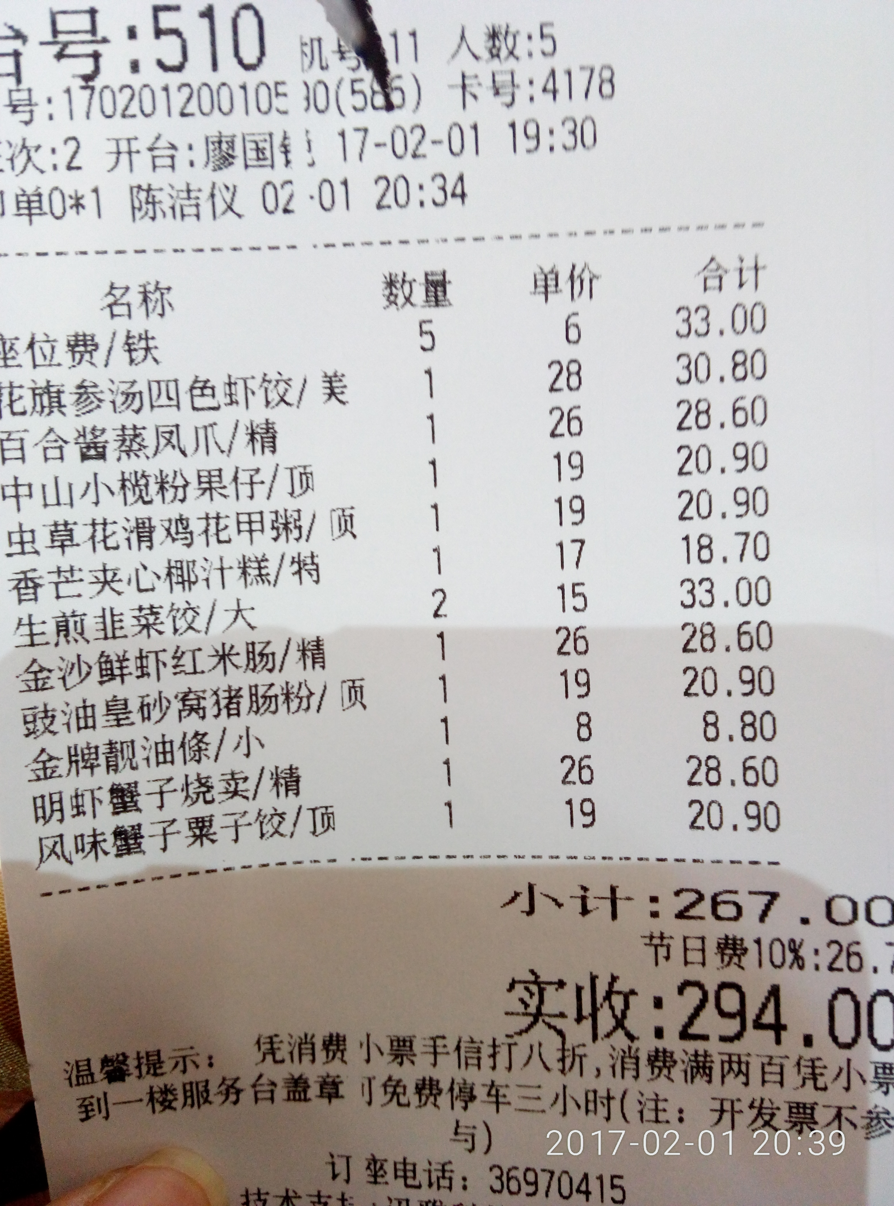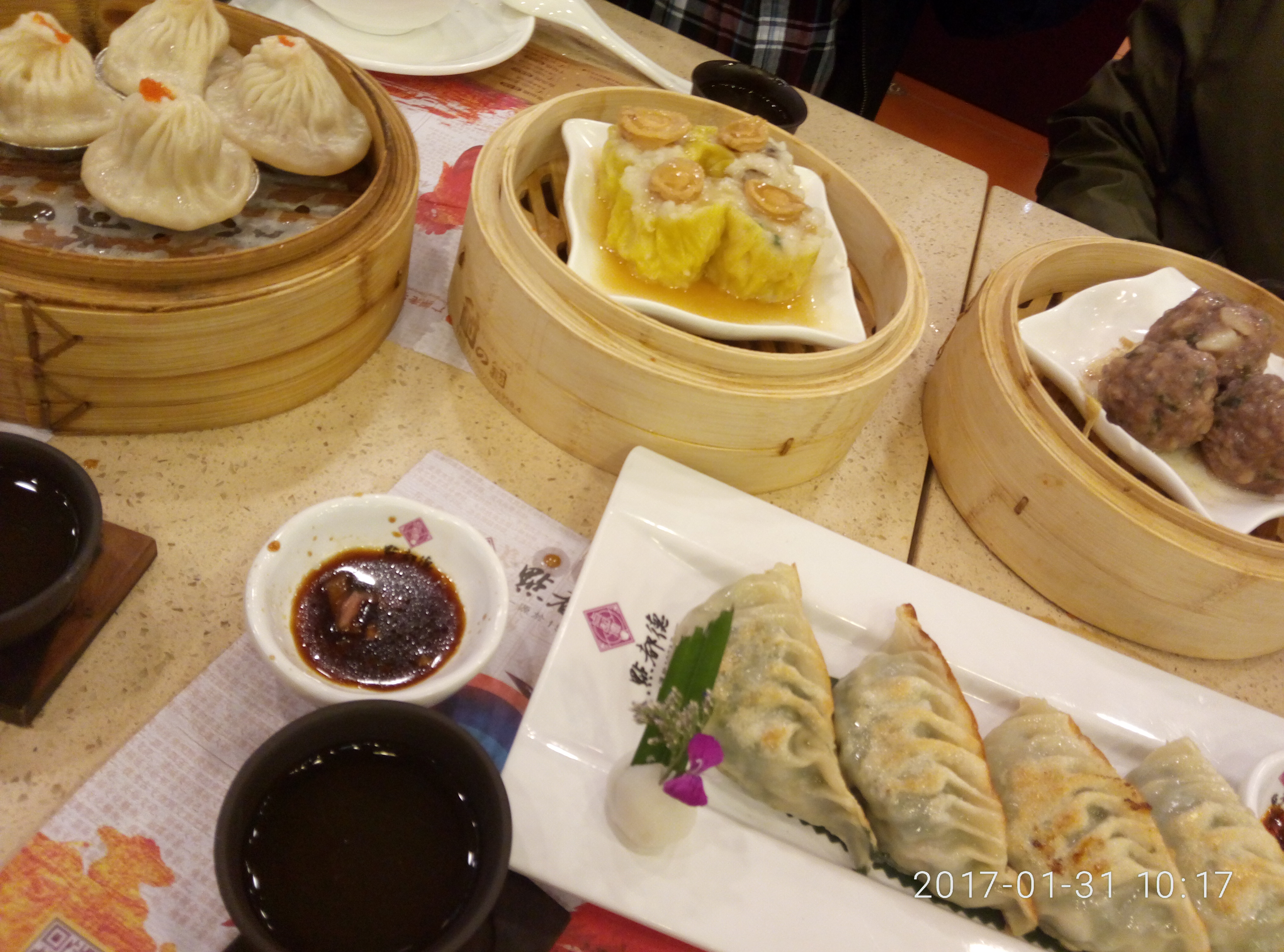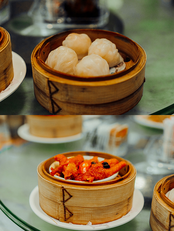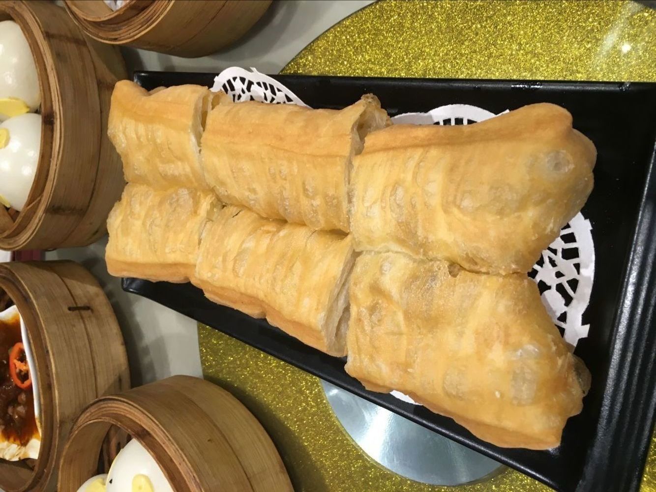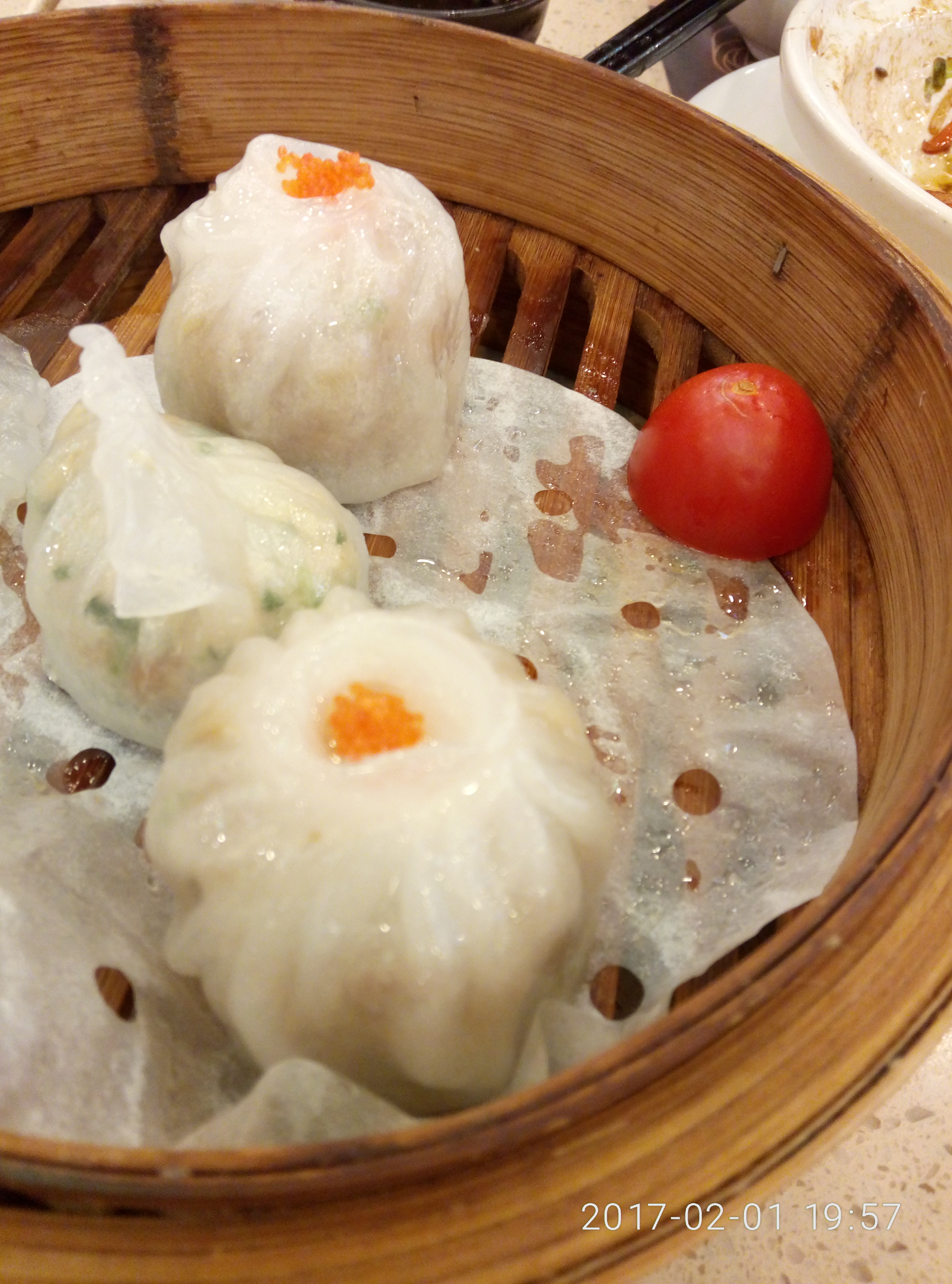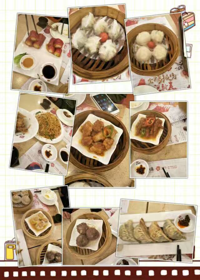 我们点了招牌菜四色虾饺、沙爹金钱肚、凤凰流沙包、金沙红米肠、金牌虾饺皇、芥末三文鱼塔、荔湾艇仔粥。