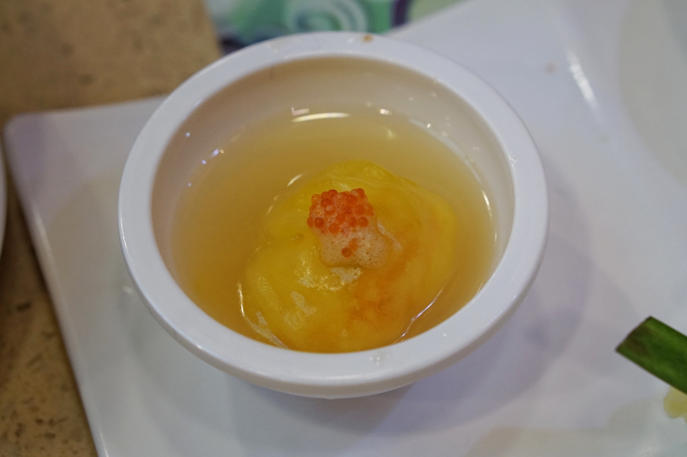 吃起来发现口感比蛋挞嫩滑一百倍,柔软中有三文鱼的厚重滋味,然而你会感到舌尖蔓延上一片芥末的味道,瞬间缴械投降。