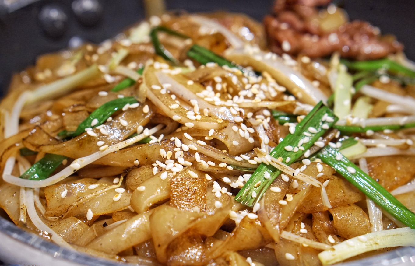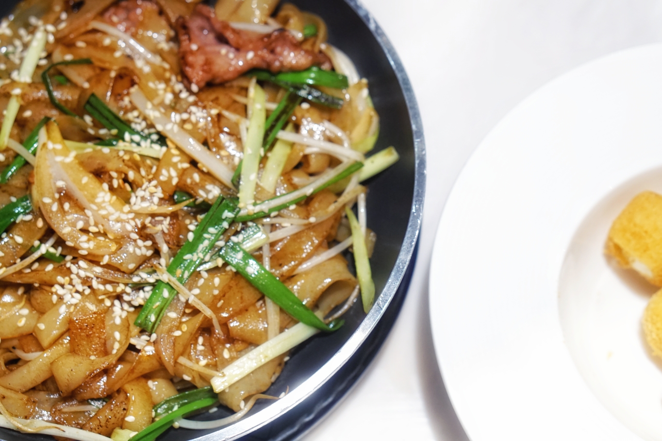 干炒牛河,牛河晶莹剔透,配上牛肉和细细的芝麻,口感丰富。