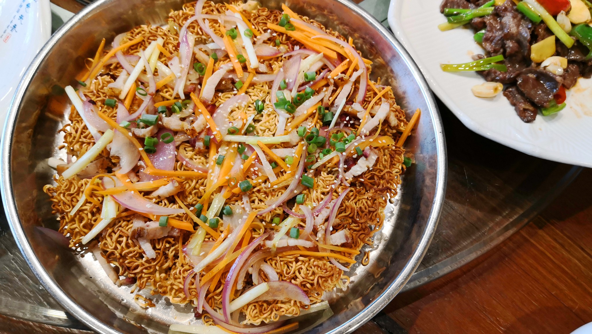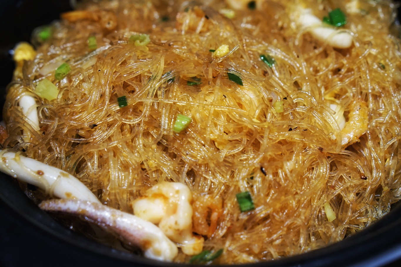 蟹黄粉丝煲里藏着很多海鲜,虾仁,鱿鱼,瑶柱,海米,粉丝被煲到镀上一层金黄,嚼起来很香。