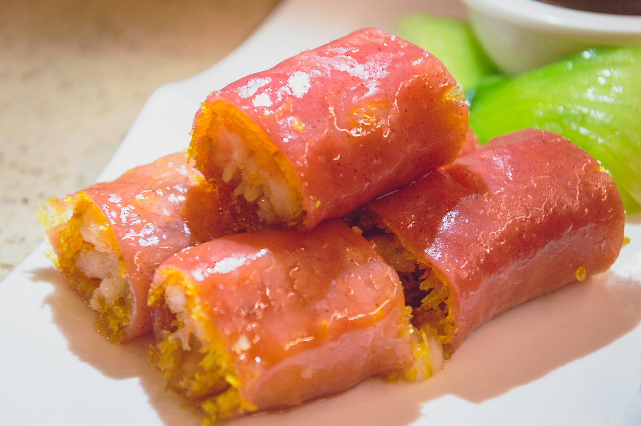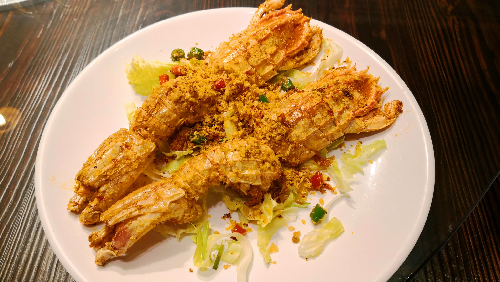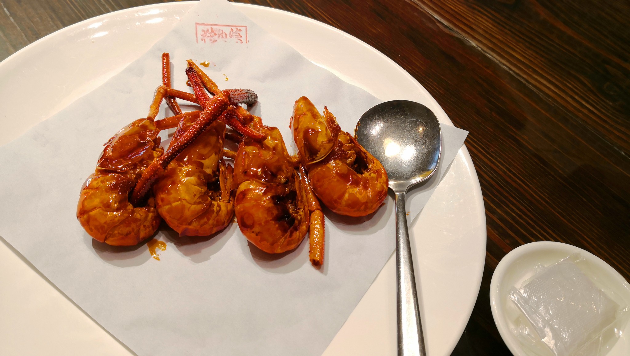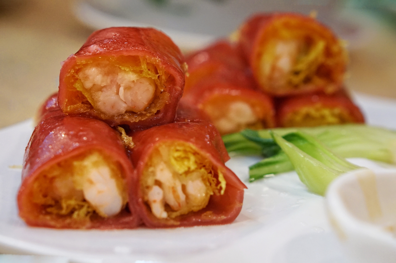 的特色,薄薄的红肠皮,里面藏着一层酥脆金黄的油条衣,再里面是圆滚滚、胖乎乎、颇具肉感的大虾,一口下去,鲜香脆甜,都有了。